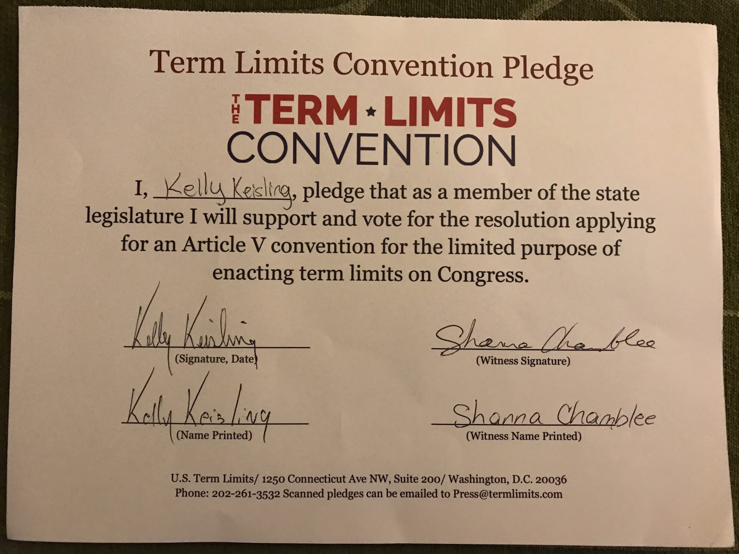 The U.S. Term Limits pledge is provided to candidates and members of state legislatures. It reads, “I pledge that, as a member of the state legislature, I will cosponsor, vote for, and defend the resolution applying for an Article V convention for the sole purpose of enacting term limits on Congress.”
