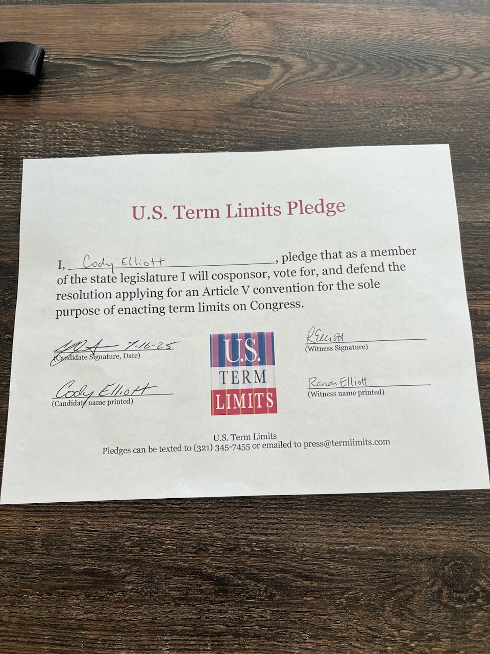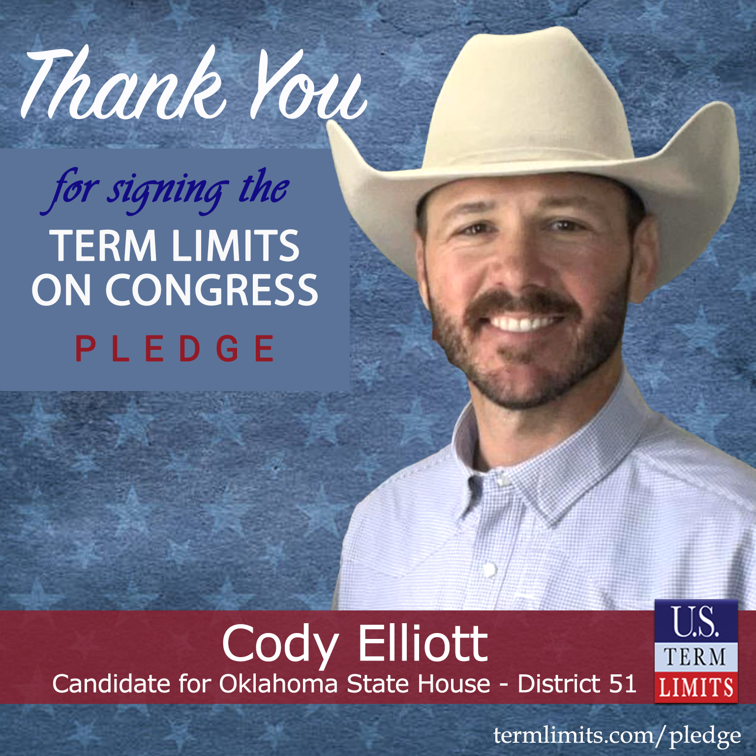 Rush Springs, OK – U.S. Term Limits (USTL), the leader in the national, non-partisan movement to limit terms for elected officials, is gathering support from state lawmakers across the nation. Its mission is to get 34 states to apply for an amendment proposal convention specific to term limits on Congress. 2026 Oklahoma state house candidate, Cody Elliott (district 51), has committed support for term limits on Congress by signing the term limits convention pledge.