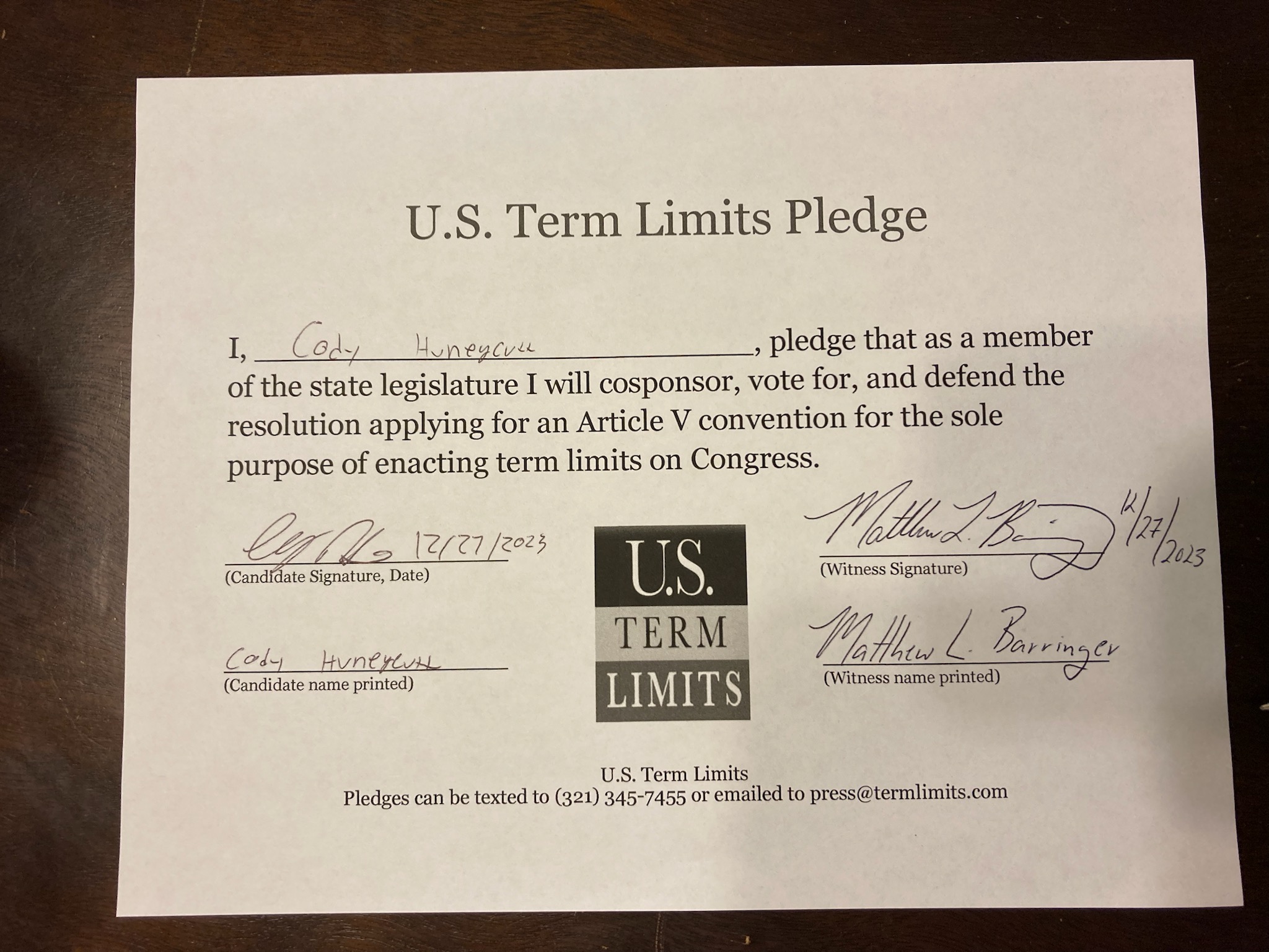 Cody Huneycutt Pledges to Support Congressional Term Limits