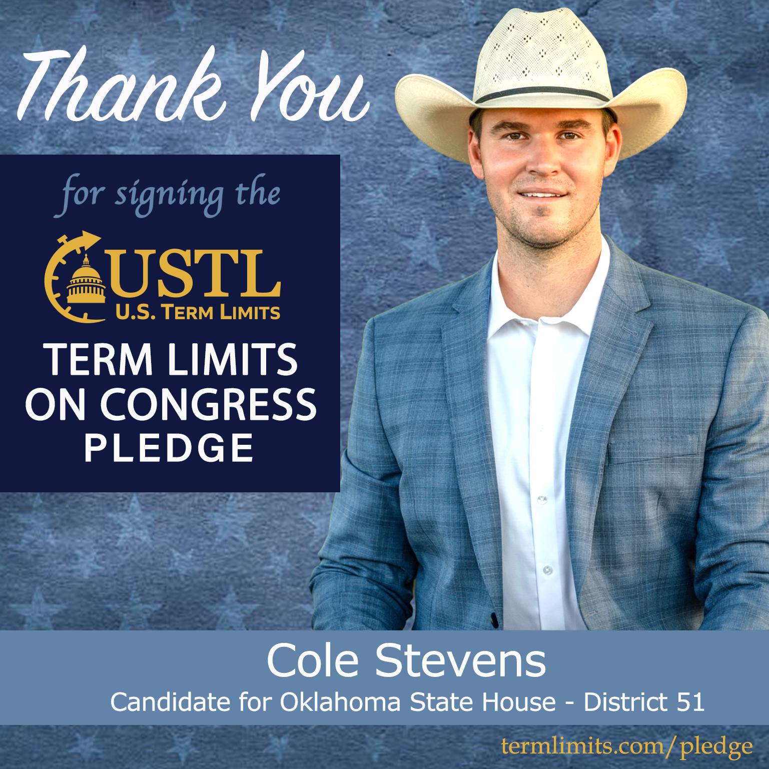 Marlow, OK – U.S. Term Limits (USTL), the leader in the national, non-partisan movement to limit terms for elected officials, is gathering support from state lawmakers across the nation. Its mission is to get 34 states to apply for an amendment proposal convention specific to term limits on Congress. Oklahoma state house candidate Cole Stevens (district 51), has committed support for term limits on Congress by signing the term limits convention pledge.