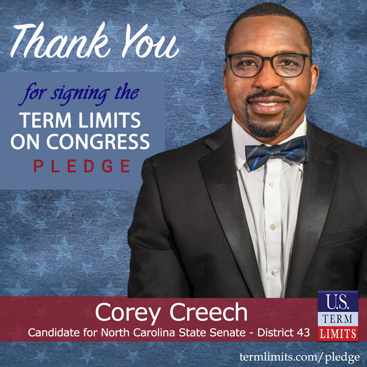 Gastonia, NC – U.S. Term Limits (USTL), the leader in the national, non-partisan movement to limit terms for elected officials, is gathering support from state lawmakers across the nation. Its mission is to get 34 states to apply for an amendment proposal convention specific to term limits on Congress. North Carolina state senate candidate, Corey Creech (district 43), has committed support for term limits on Congress by signing the term limits convention pledge.