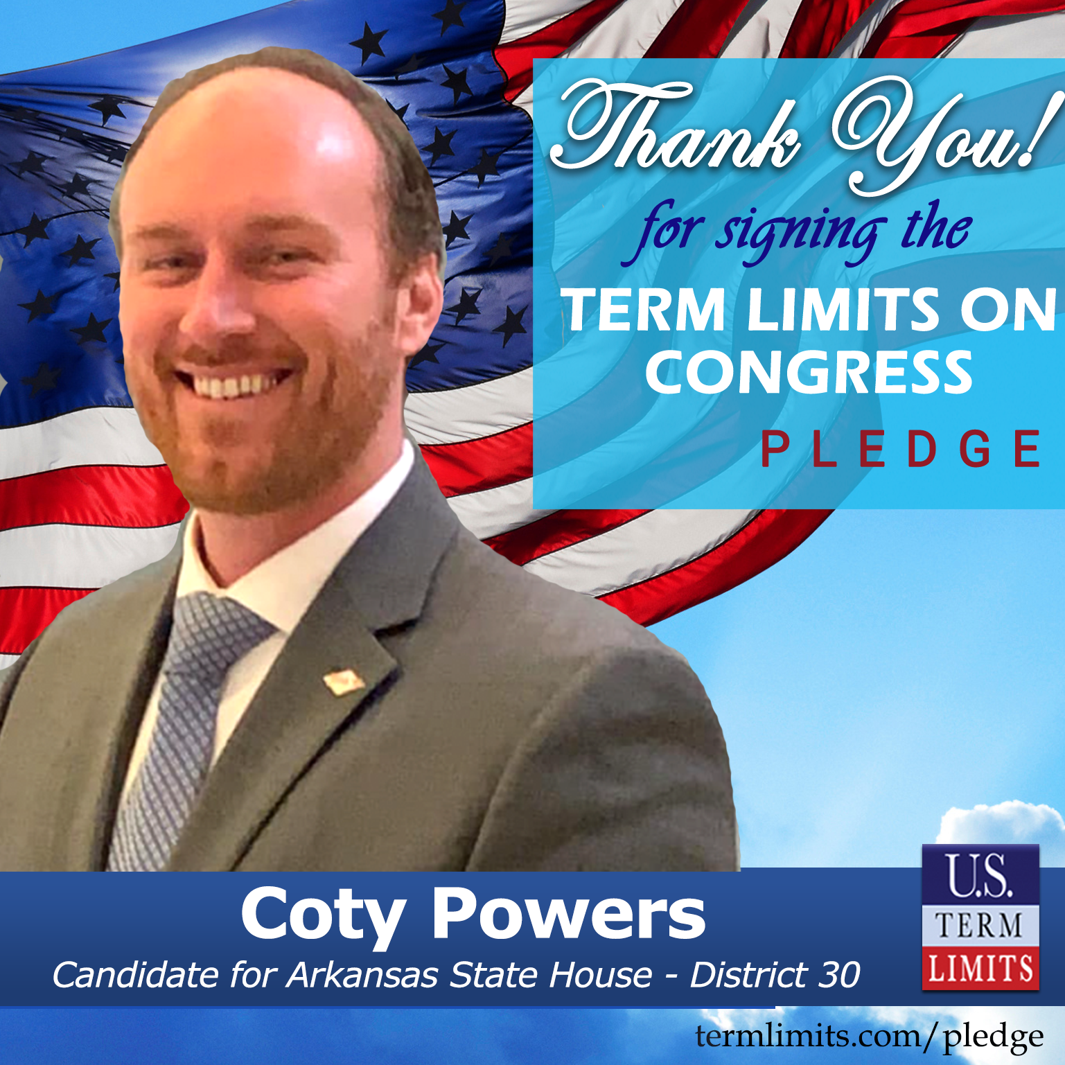 Jonesboro, AR – U.S. Term Limits (USTL), the leader in the national, non-partisan movement to limit terms for elected officials, is gathering support from state lawmakers across the nation. Its mission is to get 34 states to apply for an amendment proposal convention specific to term limits on Congress. Arkansas state house candidate, Coty Powers (District 30), has committed support for term limits on Congress by signing the Term Limits Convention Pledge. Powers is the first signer in this race.