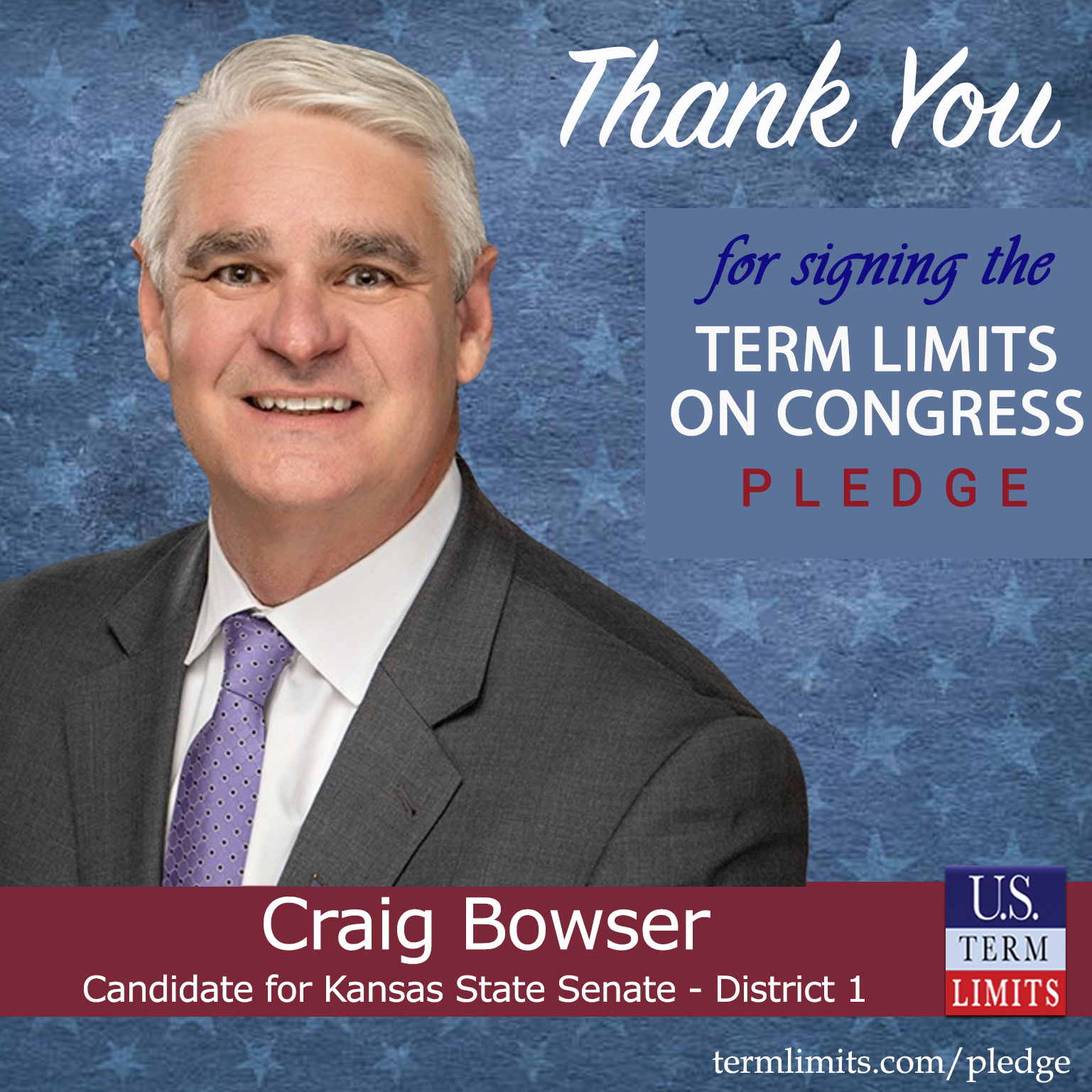 Seneca, KS – U.S. Term Limits (USTL), the leader in the national, non-partisan movement to limit terms for elected officials, is gathering support from state lawmakers across the nation. Its mission is to get 34 states to apply for an amendment proposal convention specific to term limits on Congress. Kansas state senate candidate, Craig Bowser (District 1), has committed support for term limits on Congress by signing the term limits convention pledge. Bowser is the first signer in this race.
