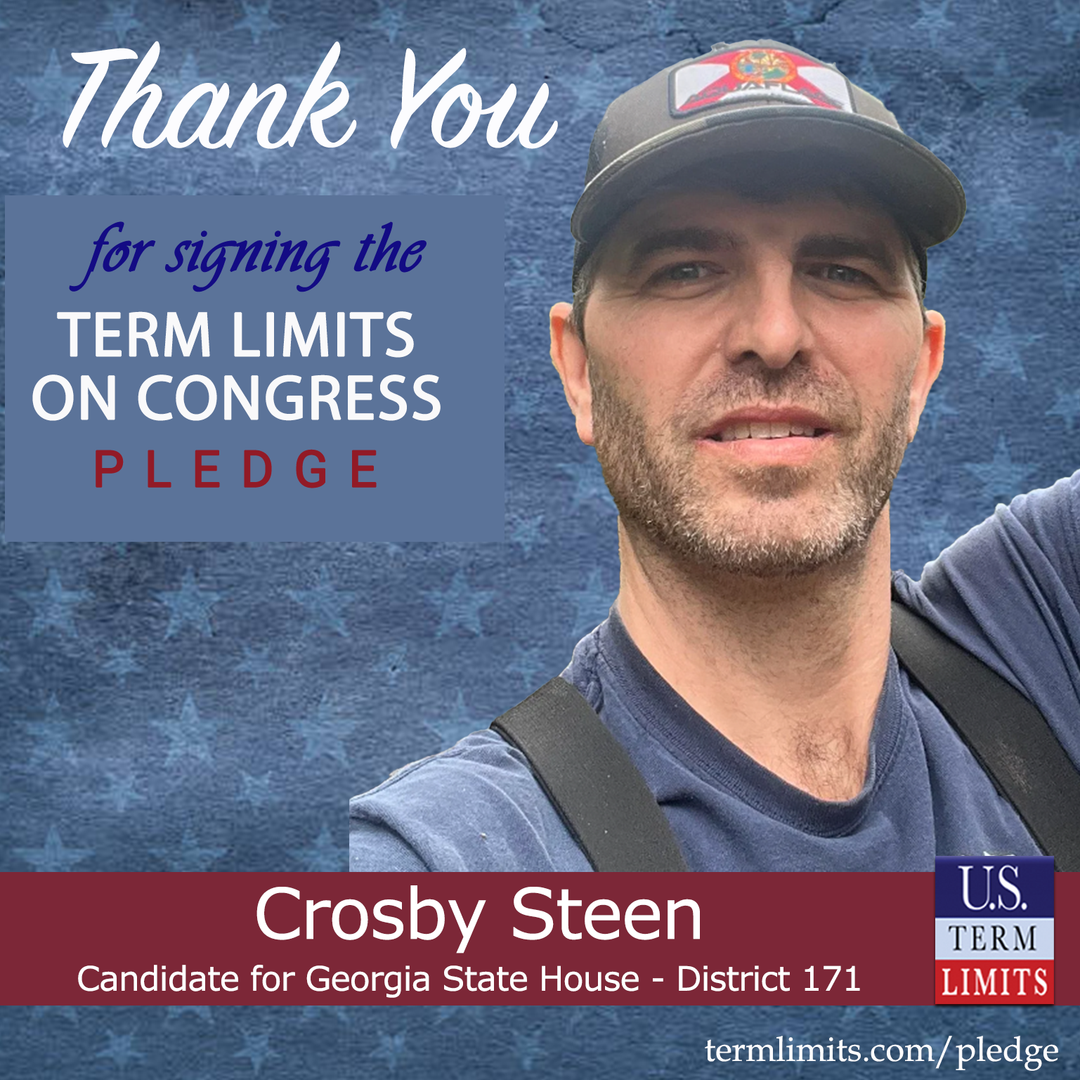 Bainbridge, GA – U.S. Term Limits (USTL), the leader in the national, non-partisan movement to limit terms for elected officials, is gathering support from state lawmakers across the nation. Its mission is to get 34 states to apply for an amendment proposal convention specific to term limits on Congress. Georgia state house candidate, Crosby Steen (District 171), has committed support for term limits on Congress by signing the term limits convention pledge. Steen is the first signer in this race.