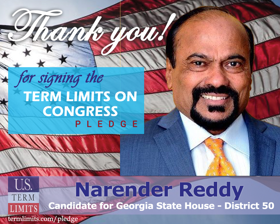 The U.S. Term Limits pledge is provided to candidates and members of state legislatures. It reads, “I pledge that, as a member of the state legislature, I will cosponsor, vote for, and defend the resolution applying for an Article V convention for the limited purpose of enacting term limits on Congress.”