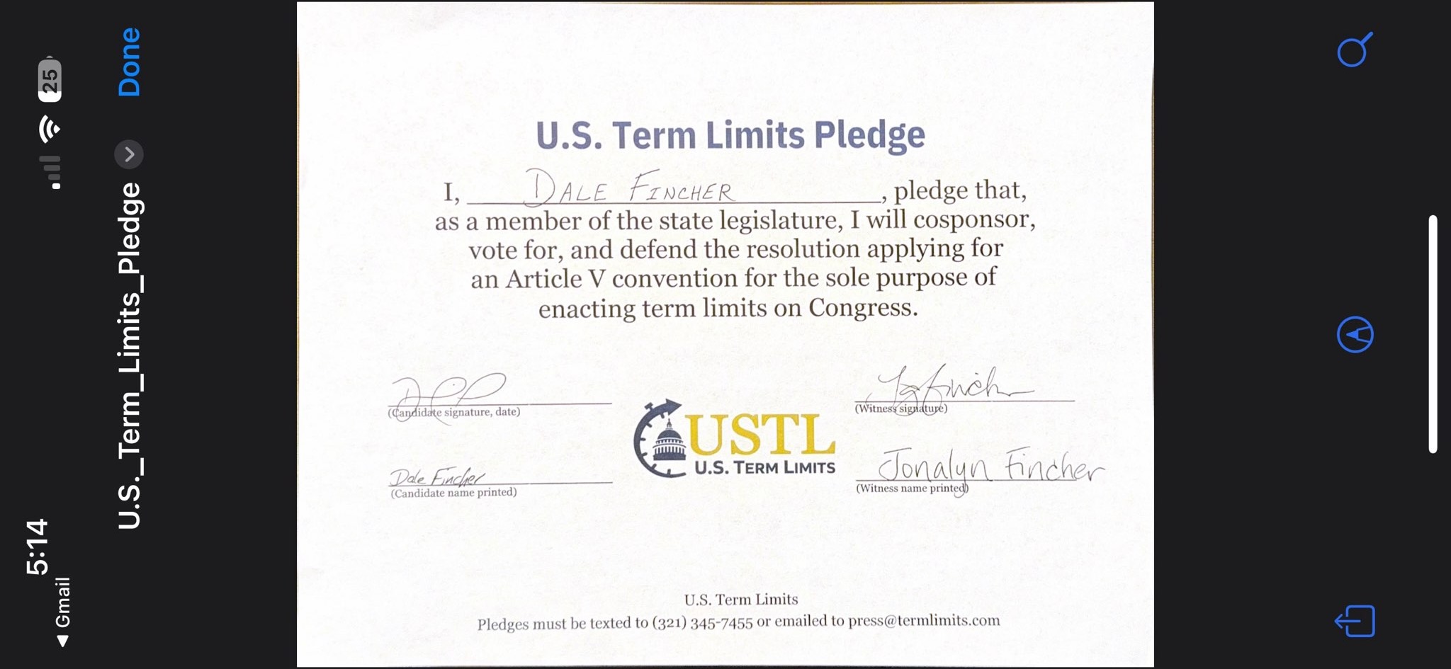 Ossipee, NH – U.S. Term Limits (USTL), the leader in the national, non-partisan movement to limit terms for elected officials, is gathering support from state lawmakers across the nation. Its mission is to get 34 states to apply for an amendment proposal convention specific to term limits on Congress. New Hampshire state house candidate, Dale Fincher (Carroll 7), has committed support for term limits on Congress by signing the term limits convention pledge.