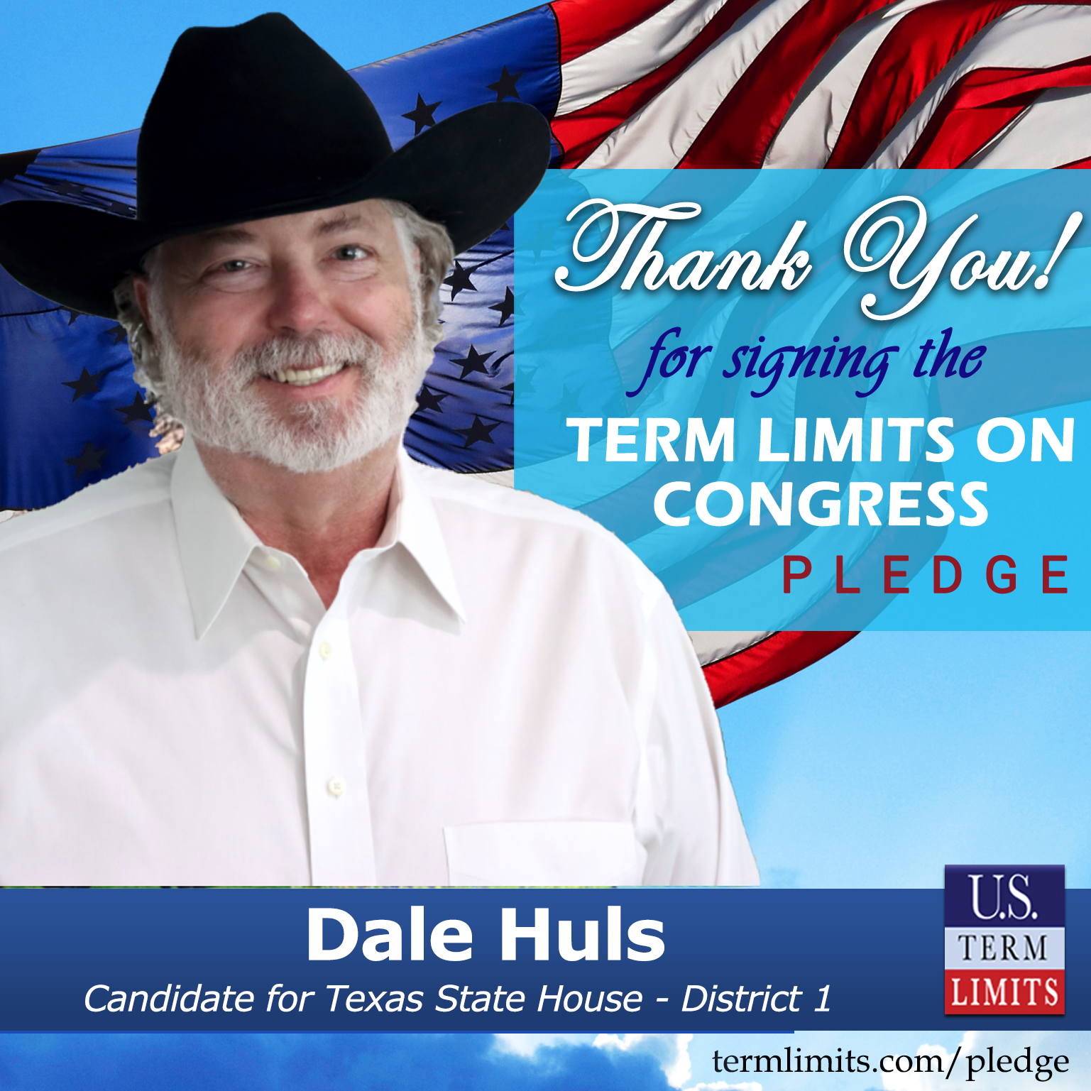 Clarksville, TX – U.S. Term Limits (USTL), the leader in the national, non-partisan movement to limit terms for elected officials, is gathering support from state lawmakers across the nation. Its mission is to get 34 states to apply for an amendment proposal convention specific to term limits on Congress. Texas state house candidate, Dale Huls (District 1), has committed support for term limits on Congress by signing the term limits convention pledge. Huls is the first signer in this race.
