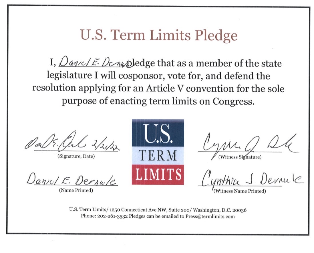 Indianapolis, IN – U.S. Term Limits (USTL), the leader in the national, non-partisan movement to limit terms for elected officials, is gathering support from state lawmakers across the nation. Its mission is to get 34 states to apply for an amendment proposal convention specific to term limits on Congress. Indiana state senate candidate, Daniel Dernulc (district 1), has committed support for term limits on Congress by signing the Term Limits Convention pledge. Dernulc is the first signer in this race.