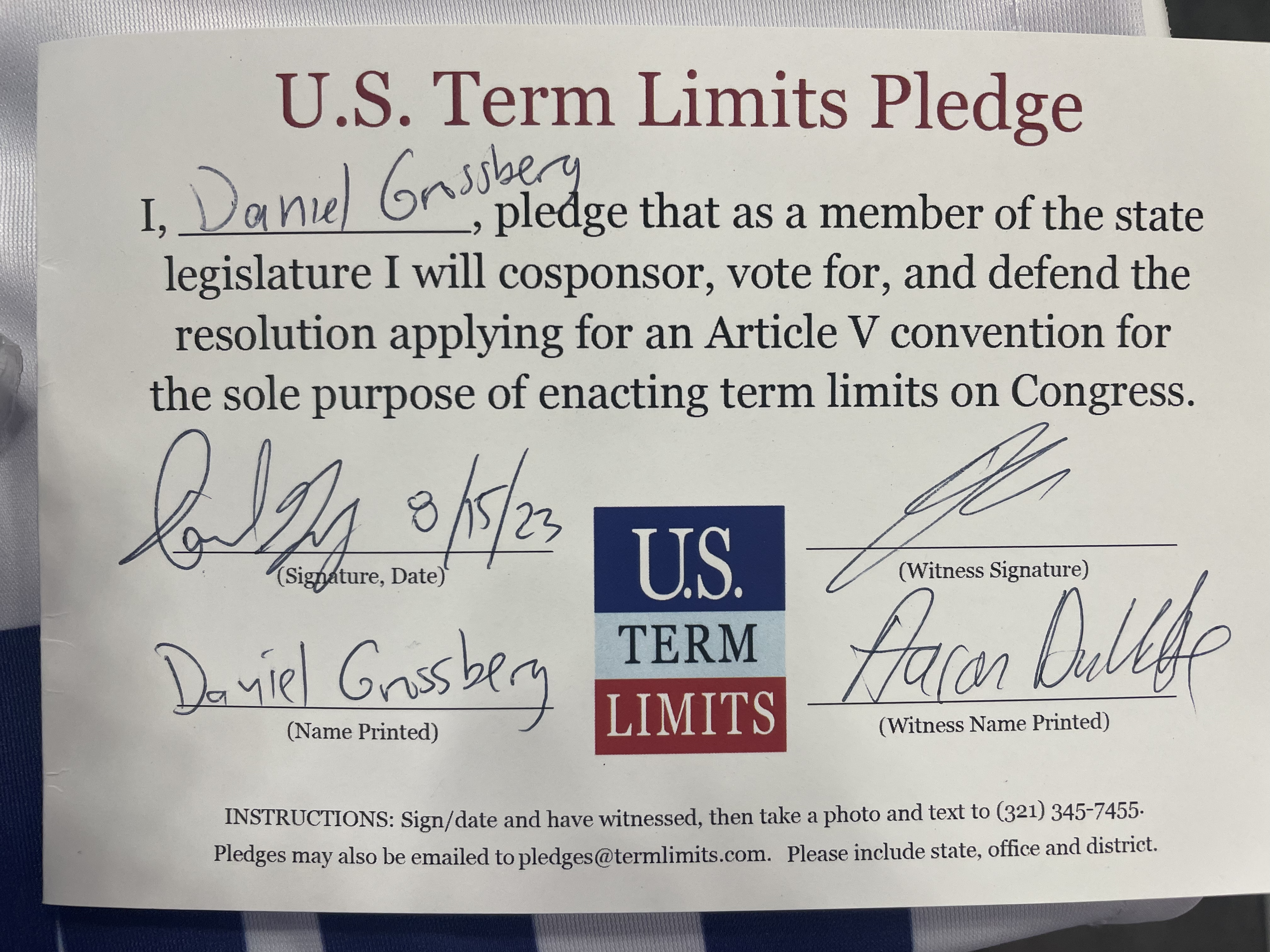The U.S. Term Limits pledge is provided to candidates and members of state legislatures. It reads, “I pledge that, as a member of the state legislature, I will cosponsor, vote for, and defend the resolution applying for an Article V convention for the sole purpose of enacting term limits on Congress.”