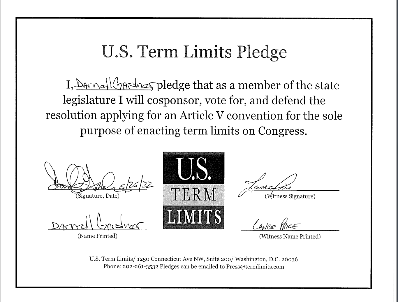 Darnell Gardner Pledges to Support Congressional Term Limits