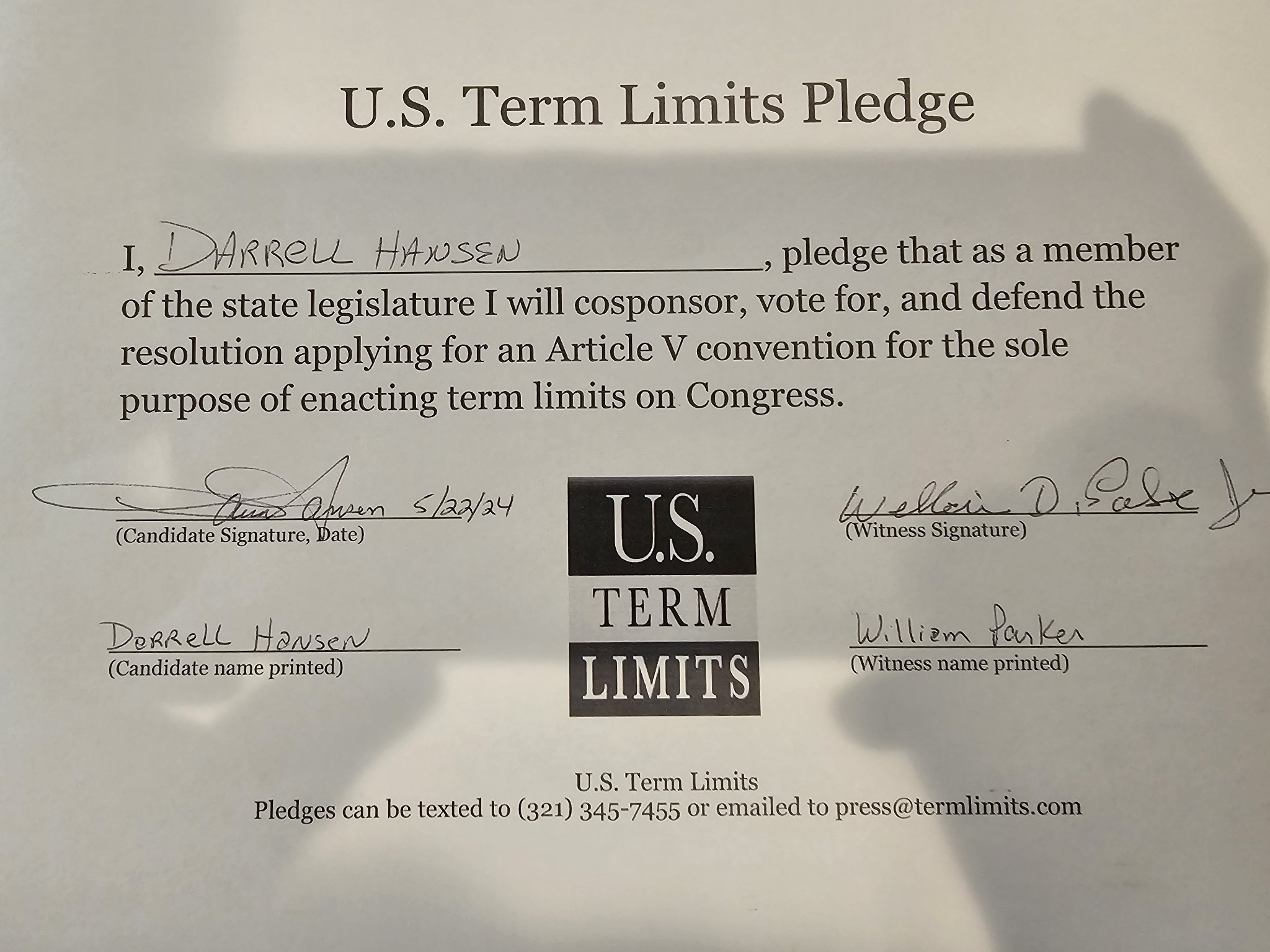 Darrell Hansen Pledges to Support Congressional Term Limits