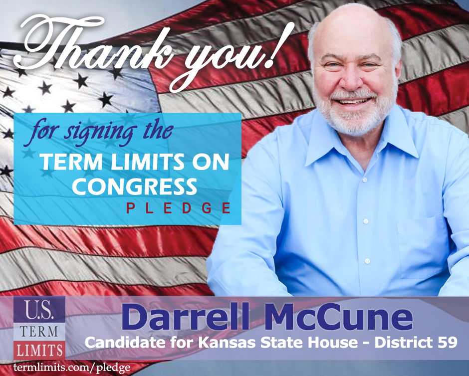 Topeka, KS – U.S. Term Limits (USTL), the leader in the national, non-partisan movement to limit terms for elected officials, is gathering support from state lawmakers across the nation. Its mission is to get 34 states to apply for an amendment proposal convention specific to term limits on Congress. Kansas state house candidate, Darrell McCune (district 59) has committed support for term limits on Congress by signing the Term Limits Convention pledge. McCune is the first signer in this race.