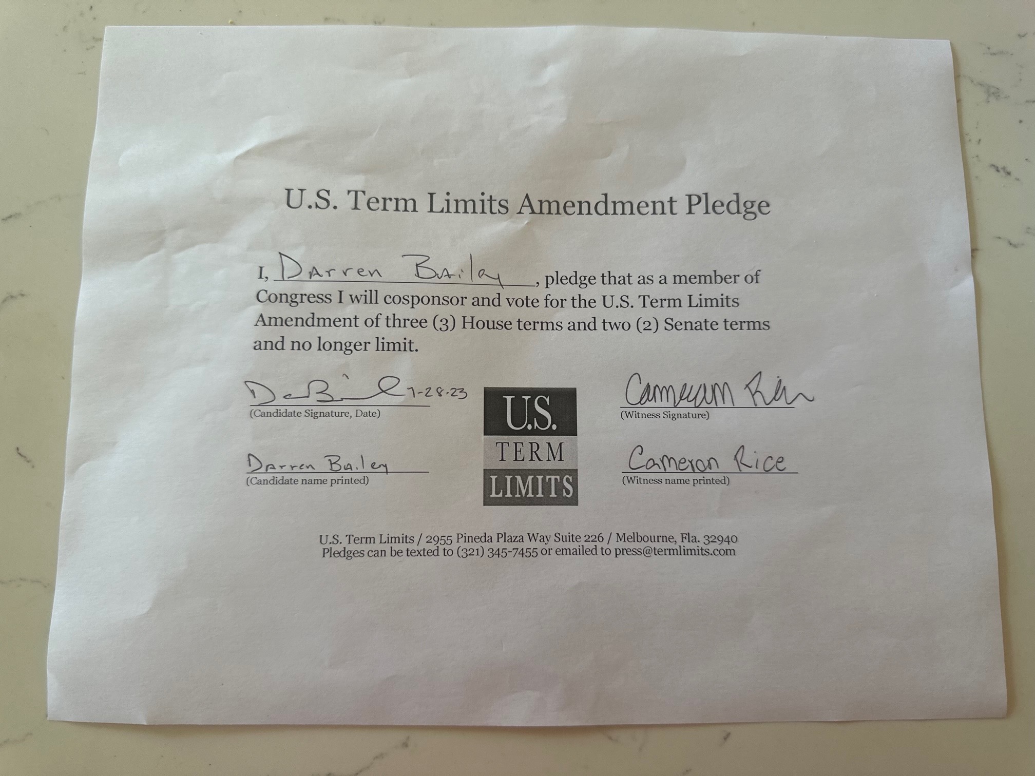 U.S. Term Limits has the support of more than 130 pledge signers in Congress. USTL President Philip Blumel commented on Bailey’s pledge saying, “Darren’s strong support of term limits shows that there are individuals who are willing to put self-interest aside to follow the will of the people. America needs a Congress that will be served by citizen legislators, not career politicians.”