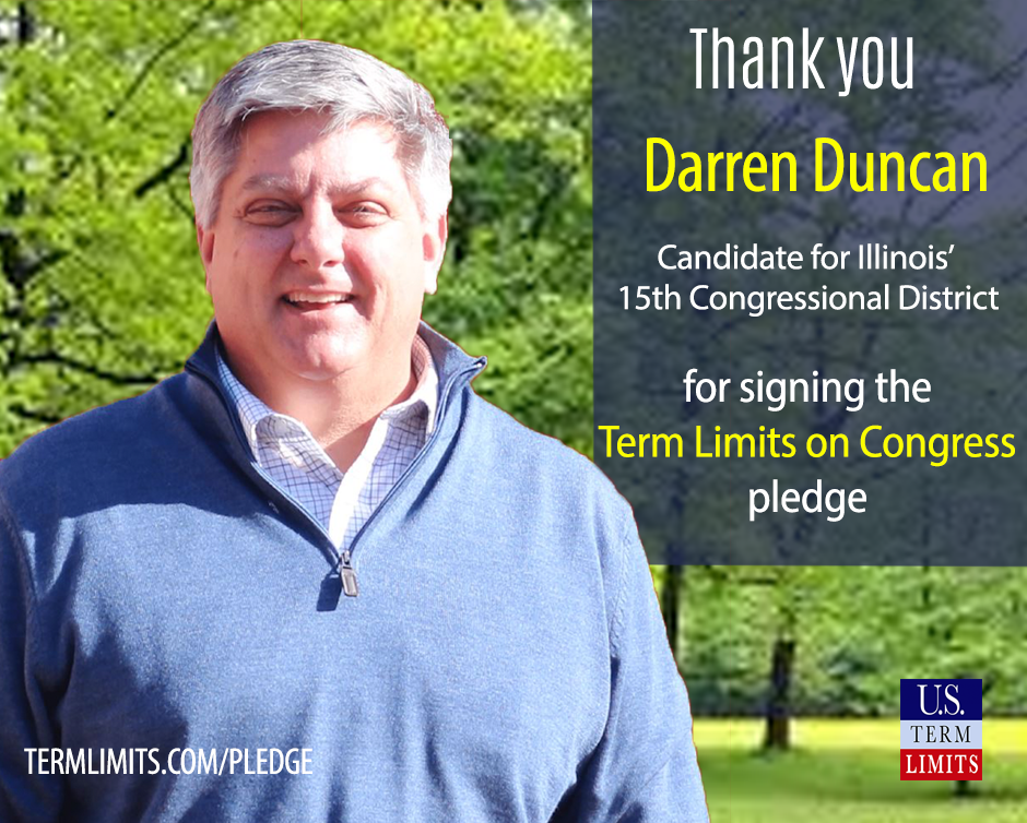 Washington, DC – U.S. Term Limits (USTL), the leader in the non-partisan national movement to limit terms for elected officials, praises 2020 U.S. House candidate for Illinois (district 15), Darren Duncan, for signing the pledge for an amendment to term limit Congress. Previously, candidates Mary Miller and Kerry Wolff also signed the pledge. Duncan hopes to fill the seat of U.S. Rep. John Shimkus, who will not seek re-election in 2020. The primary election is scheduled for March 17, 2020.