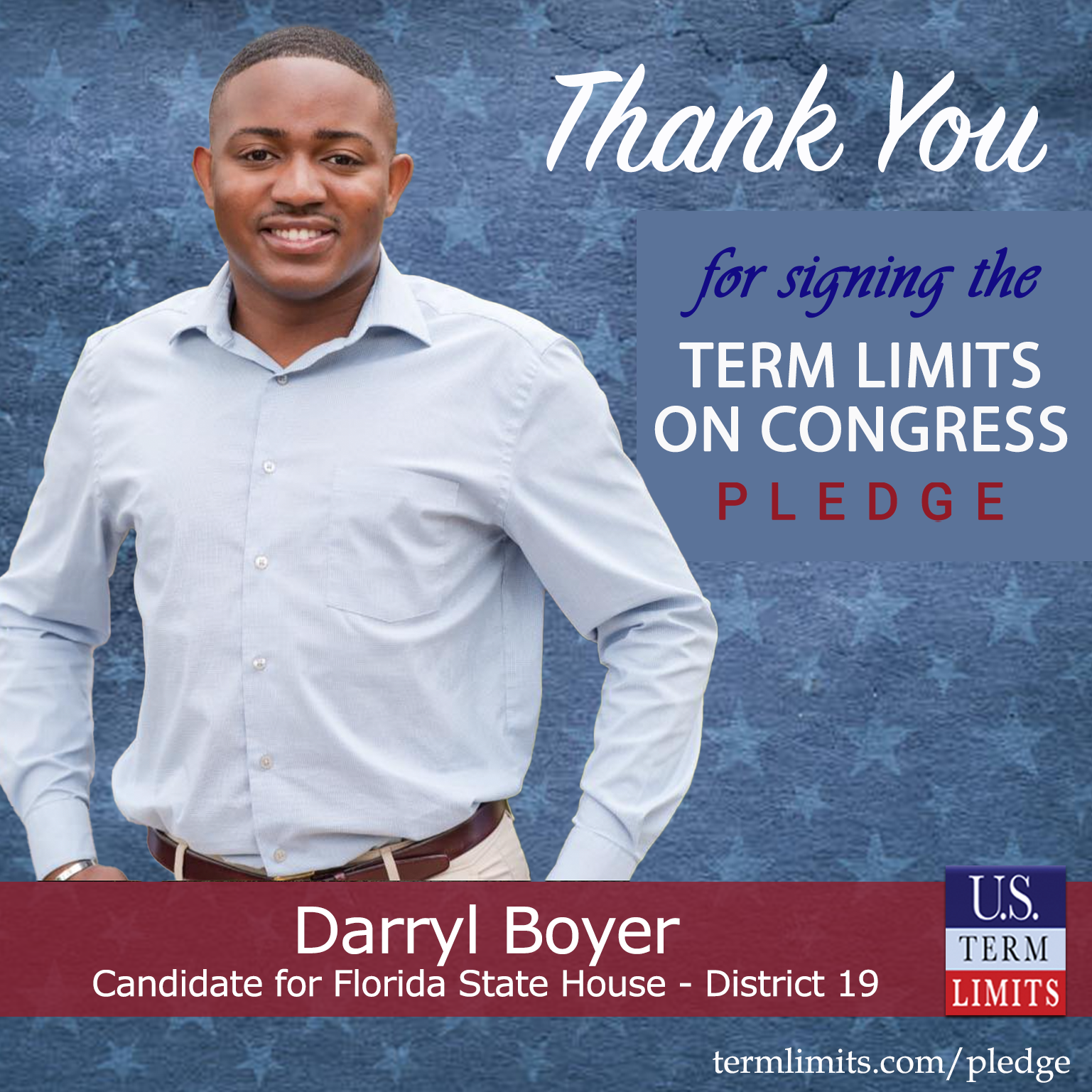 USTL President, Philip Blumel, commented on Boyer’s pledge saying, “Darryl’s strong support of term limits shows that there are individuals who are willing to listen to the majority of voters who want term limits. America needs a Congress that will be served by citizen legislators, not career politicians.”