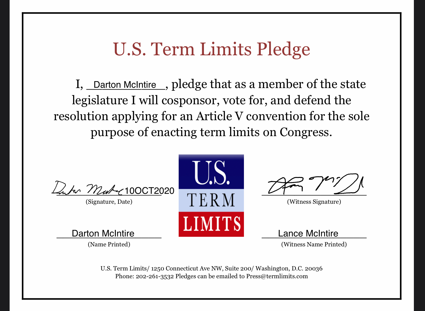 Washington, D.C. – U.S. Term Limits (USTL), the leader in the national, non-partisan movement to limit terms for elected officials, is gathering support from state lawmakers across the nation. Its mission is to get 34 states to apply for an amendment proposal convention specific to term limits on Congress. 2020 West Virginia house candidate, Darton McIntire (district 50), has committed support for term limits on Congress by signing the Term Limits Convention pledge. Previously, candidate Guy Ward also signed the pledge.