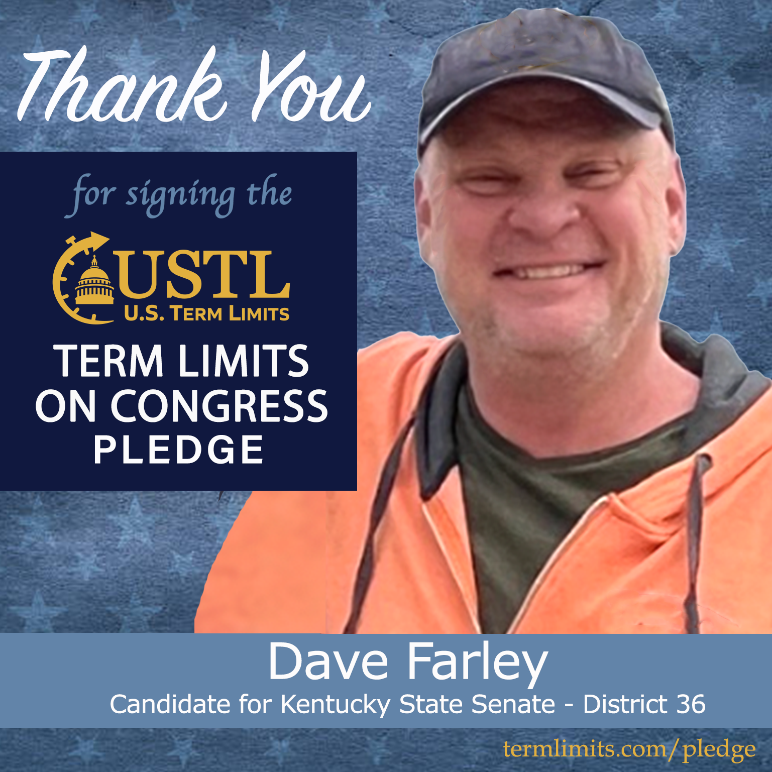 Anchorage, KY – U.S. Term Limits (USTL), the leader in the national, non-partisan movement to limit terms for elected officials, is gathering support from state lawmakers across the nation. Its mission is to get 34 states to apply for an amendment proposal convention specific to term limits on Congress. Kentucky state senate candidate, Dave Farley (district 36), has committed support for term limits on Congress by signing the term limits convention pledge.