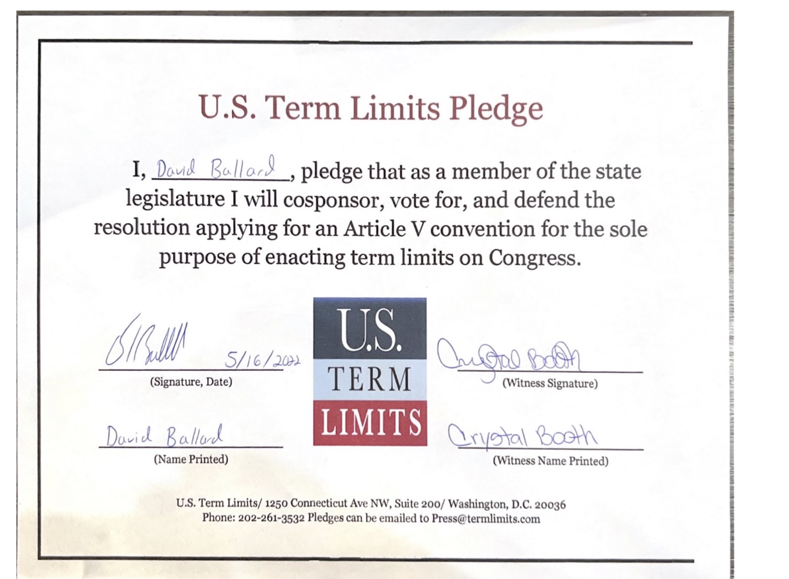USTL President, Philip Blumel, commented on Ballard’s pledge saying, “David’s support of term limits shows that there are individuals who are willing to listen to the majority of voters who want term limits. America needs a Congress that will be served by citizen legislators, not career politicians.”