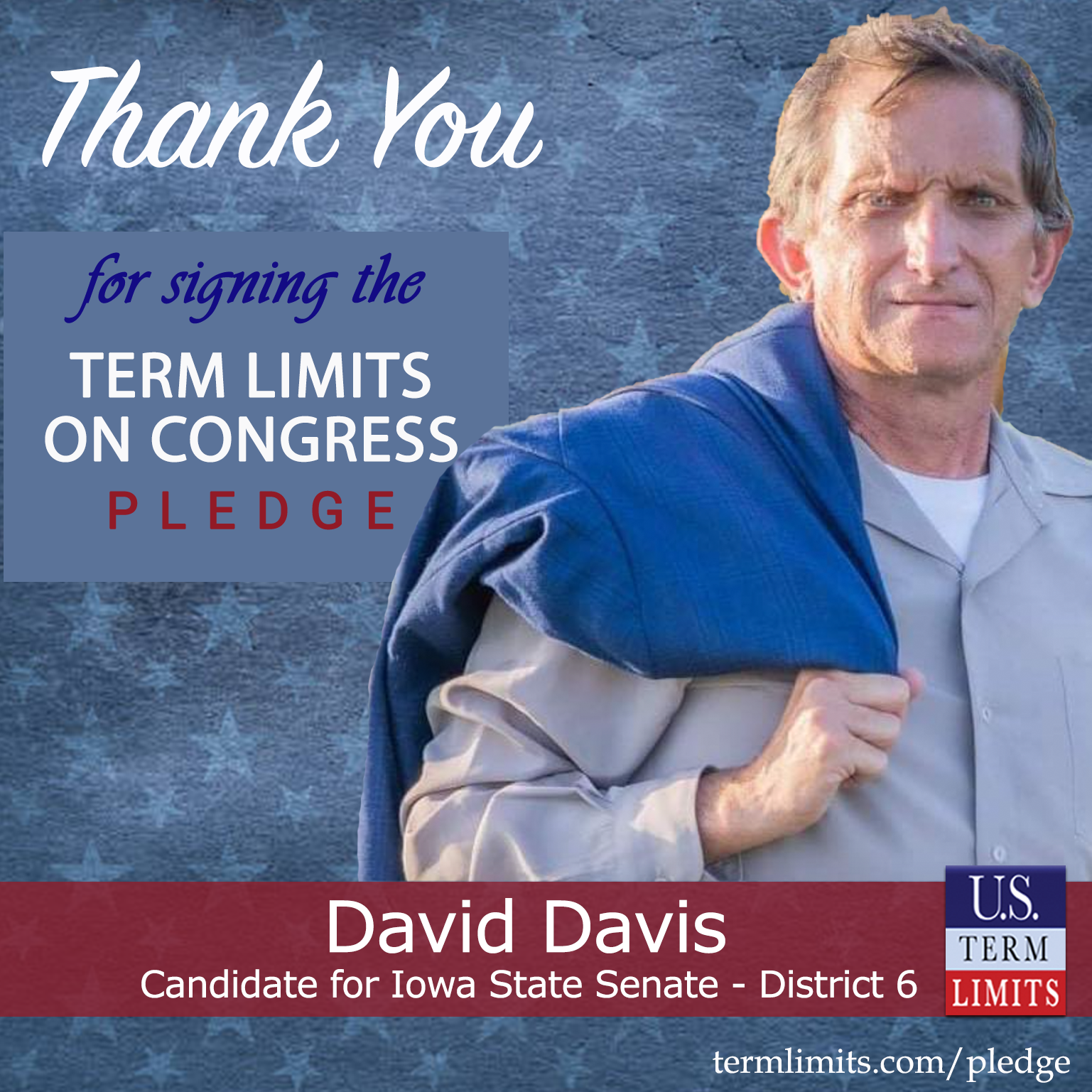 Denison, IA – U.S. Term Limits (USTL), the leader in the national, non-partisan movement to limit terms for elected officials, is gathering support from state lawmakers across the nation. Its mission is to get 34 states to apply for an amendment proposal convention specific to term limits on Congress. Iowa state senate candidate, David Davis (District 6), has committed support for term limits on Congress by signing the term limits convention pledge. Davis is the first signer in this race.