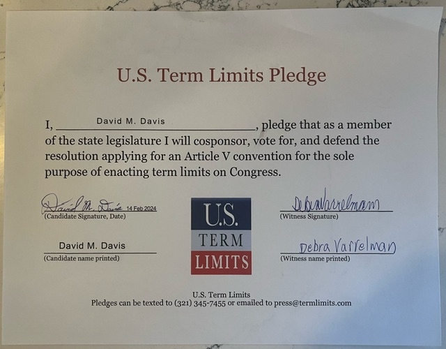 USTL President, Philip Blumel, commented on Davis’s pledge saying, “David’s strong support of term limits shows that there are individuals who are willing to listen to the majority of voters who want term limits. America needs a Congress that will be served by citizen legislators, not career politicians.”