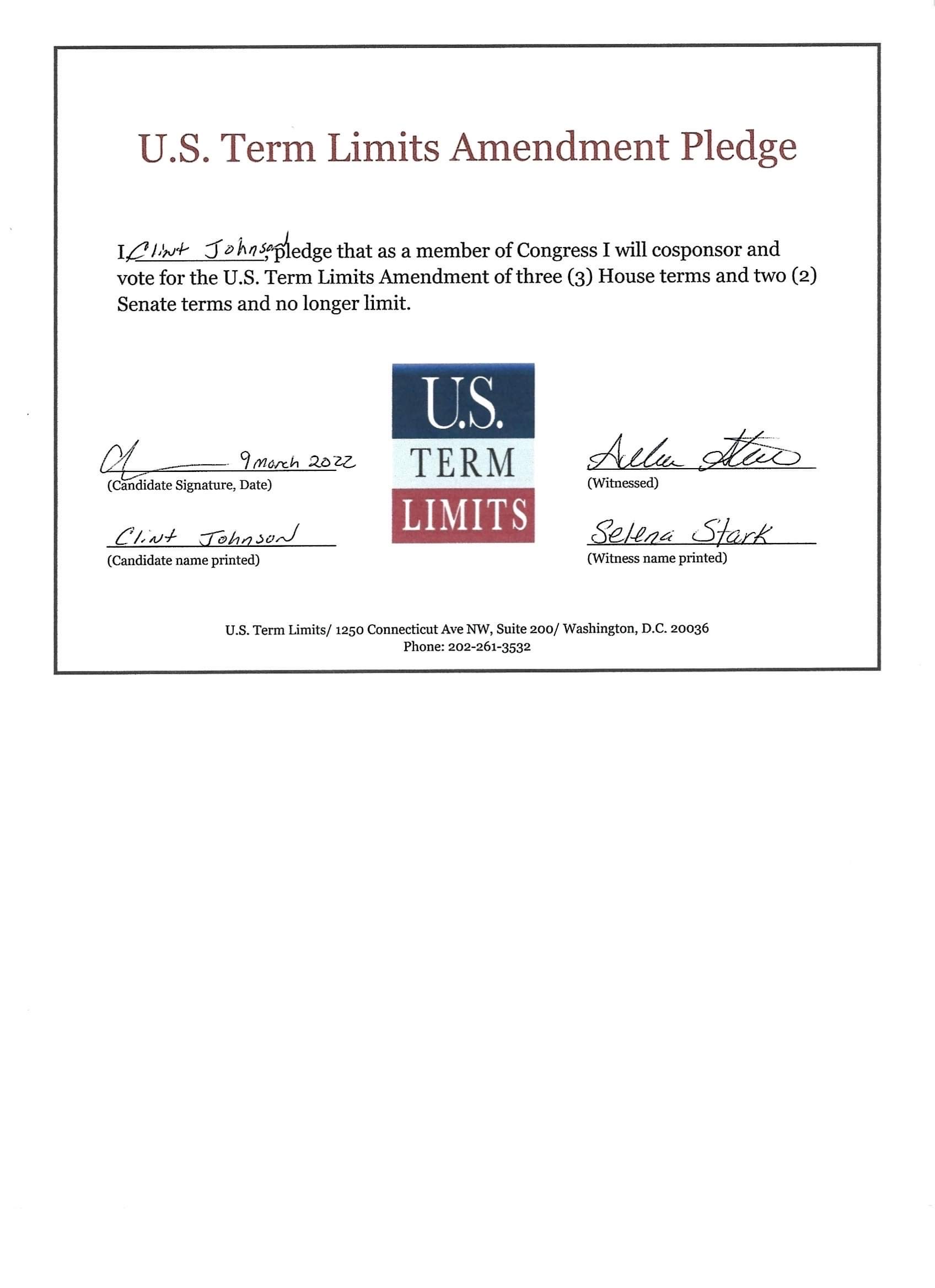 The U.S. Term Limits amendment pledge is provided to every announced candidate for federal office. It reads, “I pledge that as a member of Congress, I will cosponsor and vote for the U.S. Term Limits amendment of three (3) House terms and two (2) Senate terms and no longer limit.” The U.S. Term Limits constitutional amendment has been introduced in both the U.S. Senate by Senator Ted Cruz and his colleagues (SJR3) and the U.S. House by Representative Ralph Norman (HJR12).