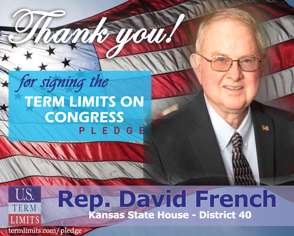“We are gaining momentum in Kansas to join the growing number of states supporting term limits on Congress. I am thrilled that Rep. French has signed the pledge in support and will help us pass this critical resolution,” said Sara Hart Weir, state chair for U.S. Term Limits.
