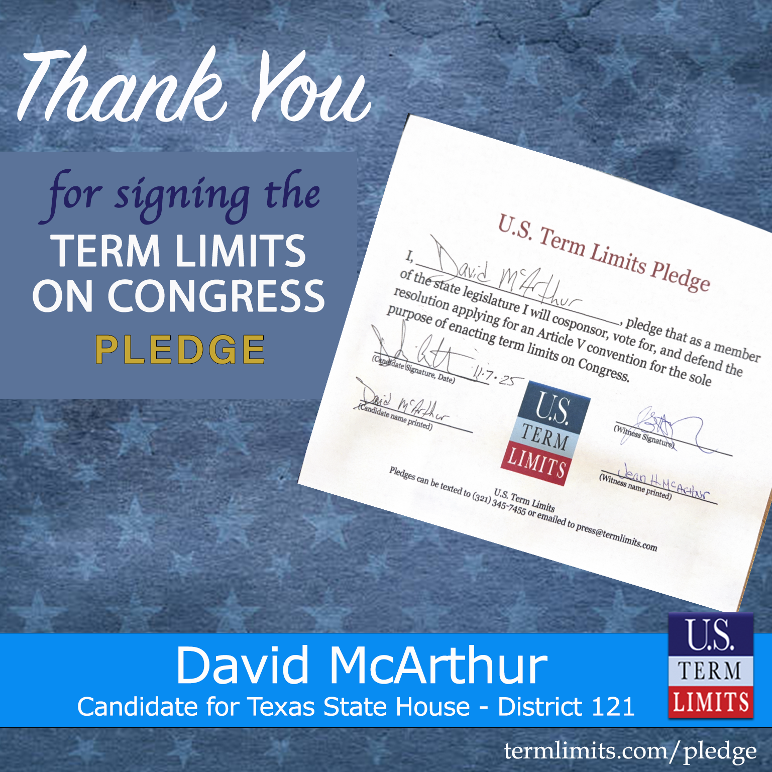 San Antonio, TX – U.S. Term Limits (USTL), the leader in the national, non-partisan movement to limit terms for elected officials, is gathering support from state lawmakers across the nation. Its mission is to get 34 states to apply for an amendment proposal convention specific to term limits on Congress. 2026 Texas state house candidate, David McArthur (district 121), has committed support for term limits on Congress by signing the term limits convention pledge.