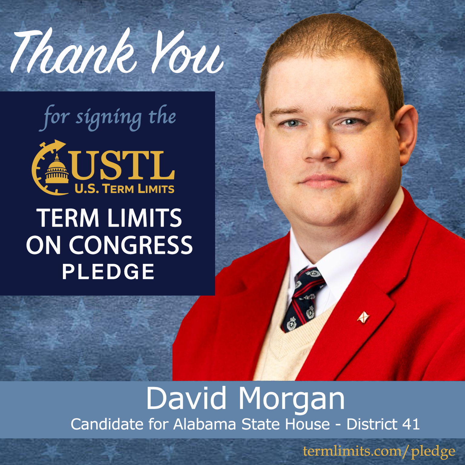 Calera, AL – U.S. Term Limits (USTL), the leader in the national, non-partisan movement to limit terms for elected officials, is gathering support from state lawmakers across the nation. Its mission is to get 34 states to apply for an amendment proposal convention specific to term limits on Congress. 2026 Alabama state house candidate, David Morgan (district 41), has committed support for term limits on Congress by signing the term limits convention pledge.
