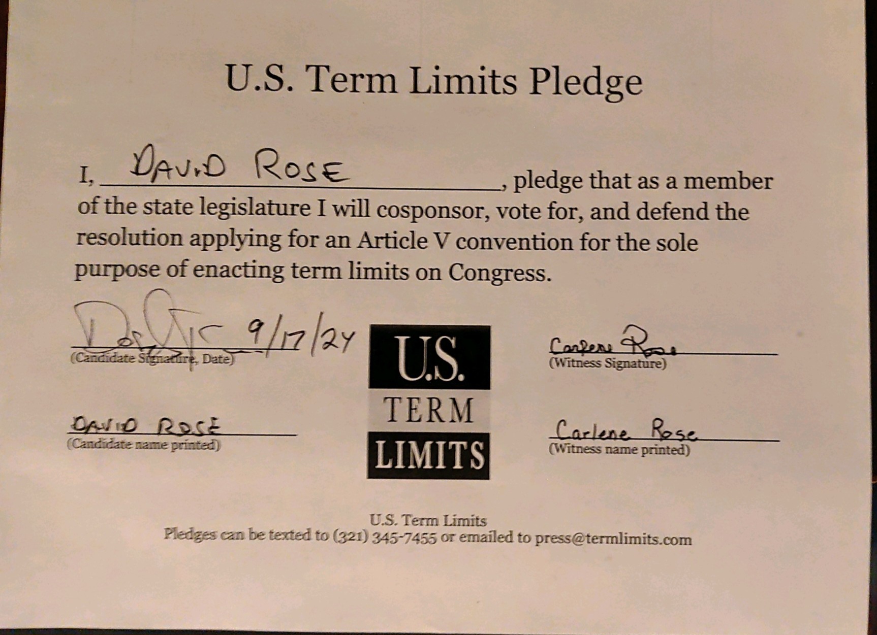Center Harbor, NH – U.S. Term Limits (USTL), the leader in the national, non-partisan movement to limit terms for elected officials, is gathering support from state lawmakers across the nation. Its mission is to get 34 states to apply for an amendment proposal convention specific to term limits on Congress. New Hampshire state house candidate, David Rose (Belknap 1), has committed support for term limits on Congress by signing the term limits convention pledge. Previously, incumbent Rep. Tom Ploszaj also signed the pledge.