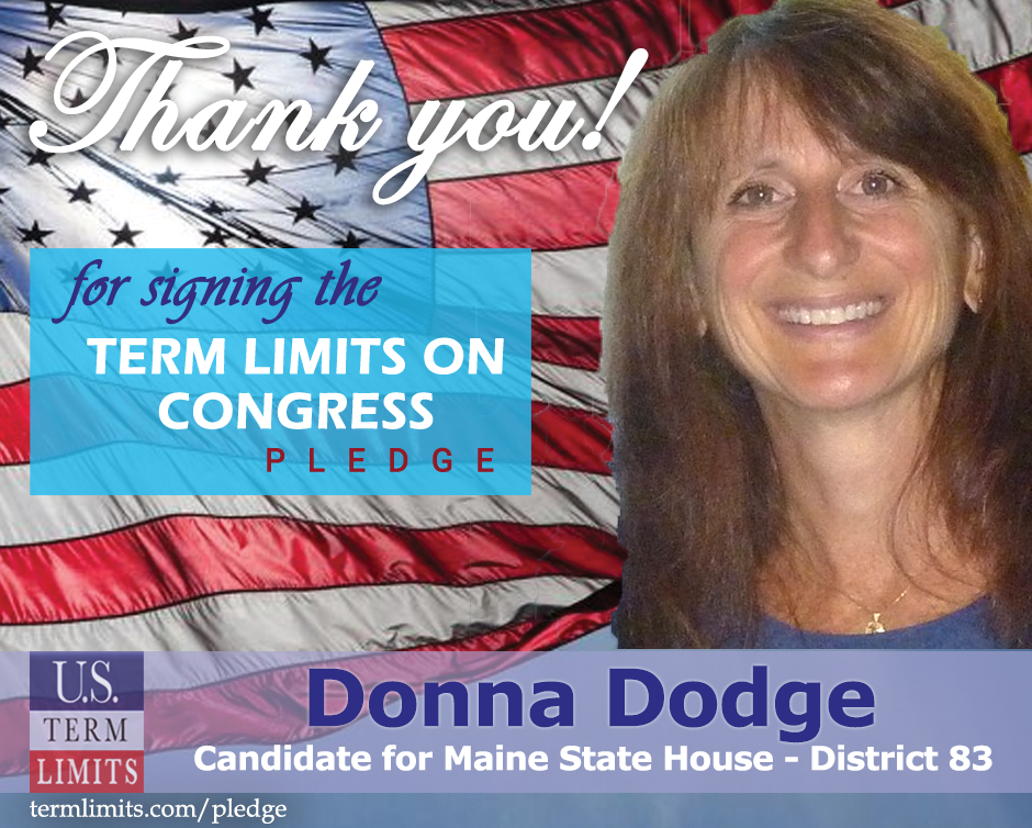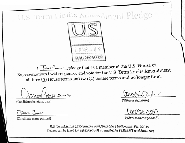 The U.S. Term Limits amendment pledge is provided to every announced candidate for federal office. It reads, “I pledge that as a member of Congress, I will cosponsor and vote for the U.S. Term Limits amendment of three (3) two-year House terms and two (2) six-year Senate terms and no longer limit.”