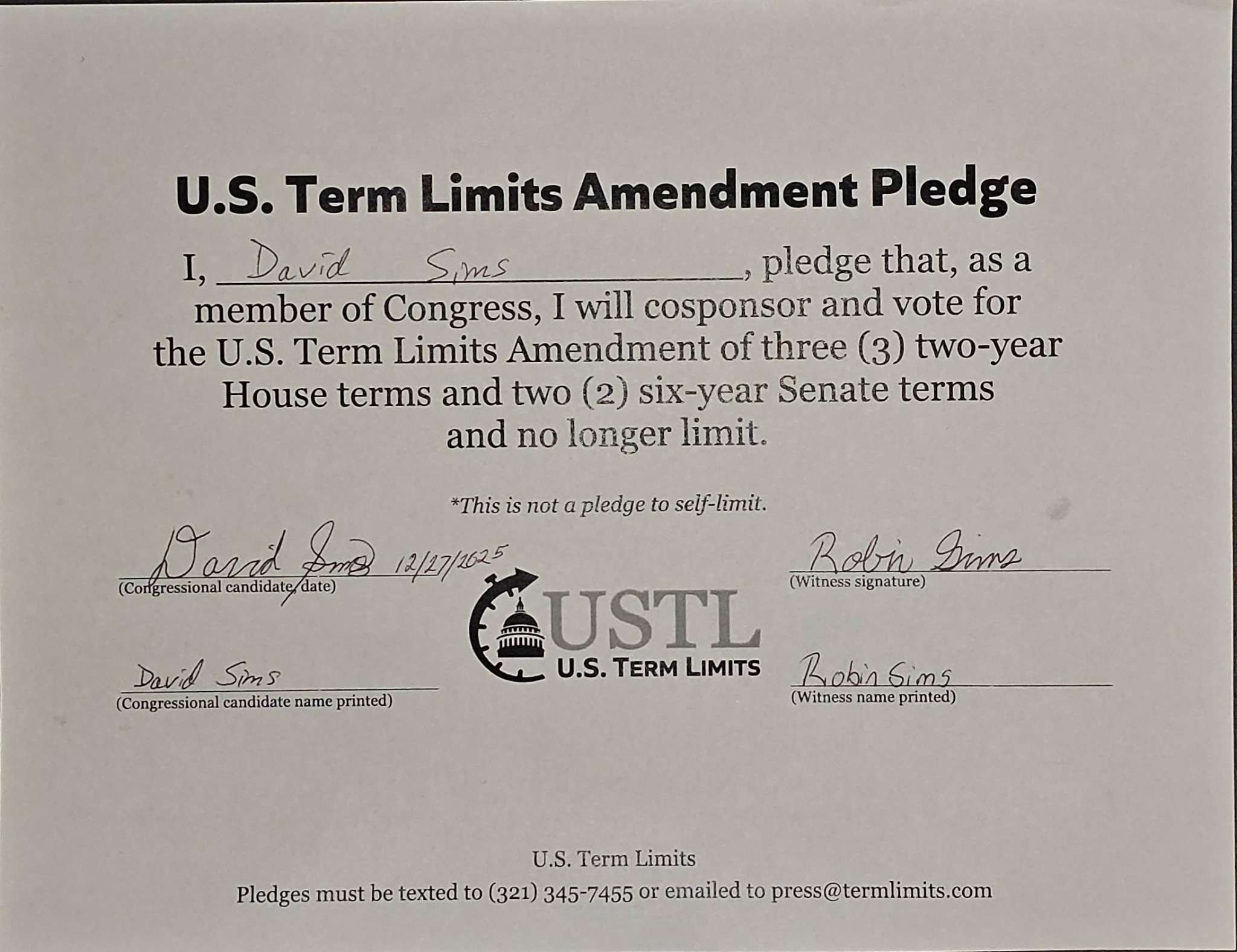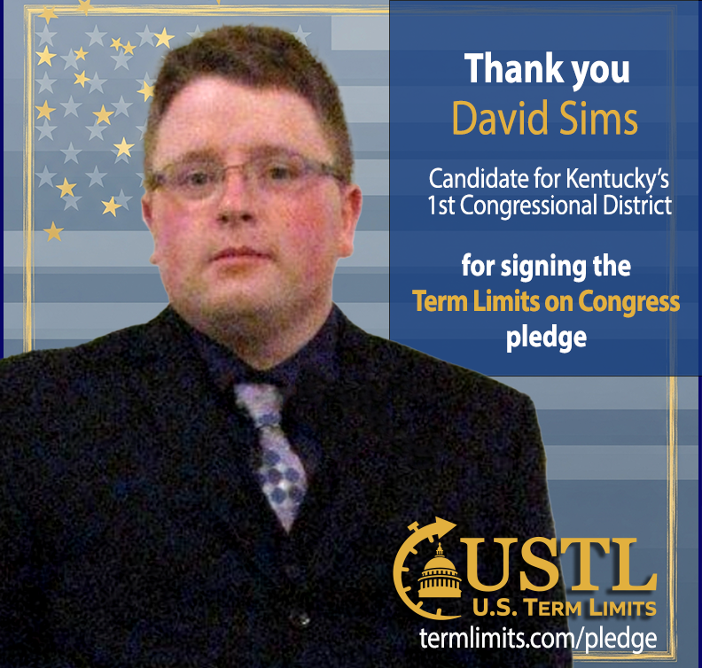 Washington D.C. – U.S. Term Limits (USTL), the leader in the non-partisan national movement to limit terms for elected officials, praises 2026 U.S. House of Representatives candidate for Kentucky, David Sims (district 1), for signing the pledge for an amendment to term limit Congress. Previously, candidate John Williams and incumbent Rep. James Comer also signed the pledge.