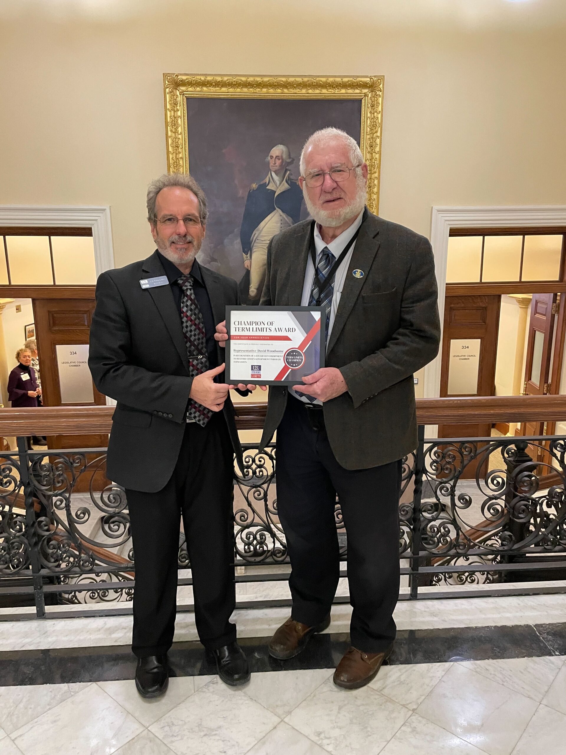 Kenn Quinn of U.S. Term Limits presented Rep. Woodsome’s the “Champion of Term Limits” plaque, which reads, “In recognition of a steadfast commitment to restore citizen government through term limits.” The U.S. Term Limits Article V convention application is limited to proposing an amendment to set a limit on the number of terms that a person may be elected as a member of the U.S. House and Senate. The Article V convention application does not specify the number of terms as that will be determined by the commissioners appointed to the convention by the state legislatures.