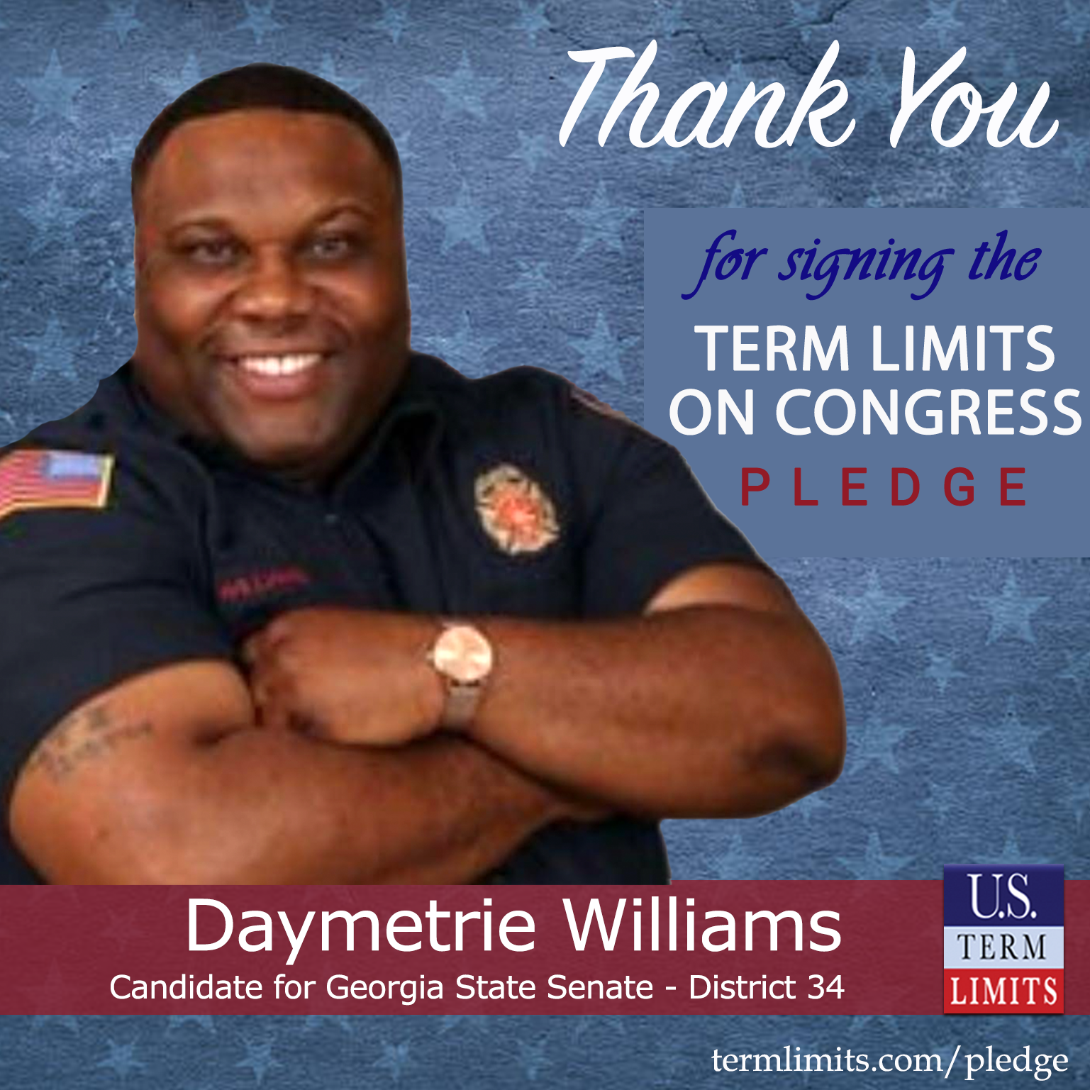 Riverdale, GA – U.S. Term Limits (USTL), the leader in the national, non-partisan movement to limit terms for elected officials, is gathering support from state lawmakers across the nation. Its mission is to get 34 states to apply for an amendment proposal convention specific to term limits on Congress. Georgia state senate candidate, Daymetrie Williams (District 34), has committed support for term limits on Congress by signing the term limits convention pledge. Previously, candidates Xe Ross and Herman Andrews also signed the pledge.