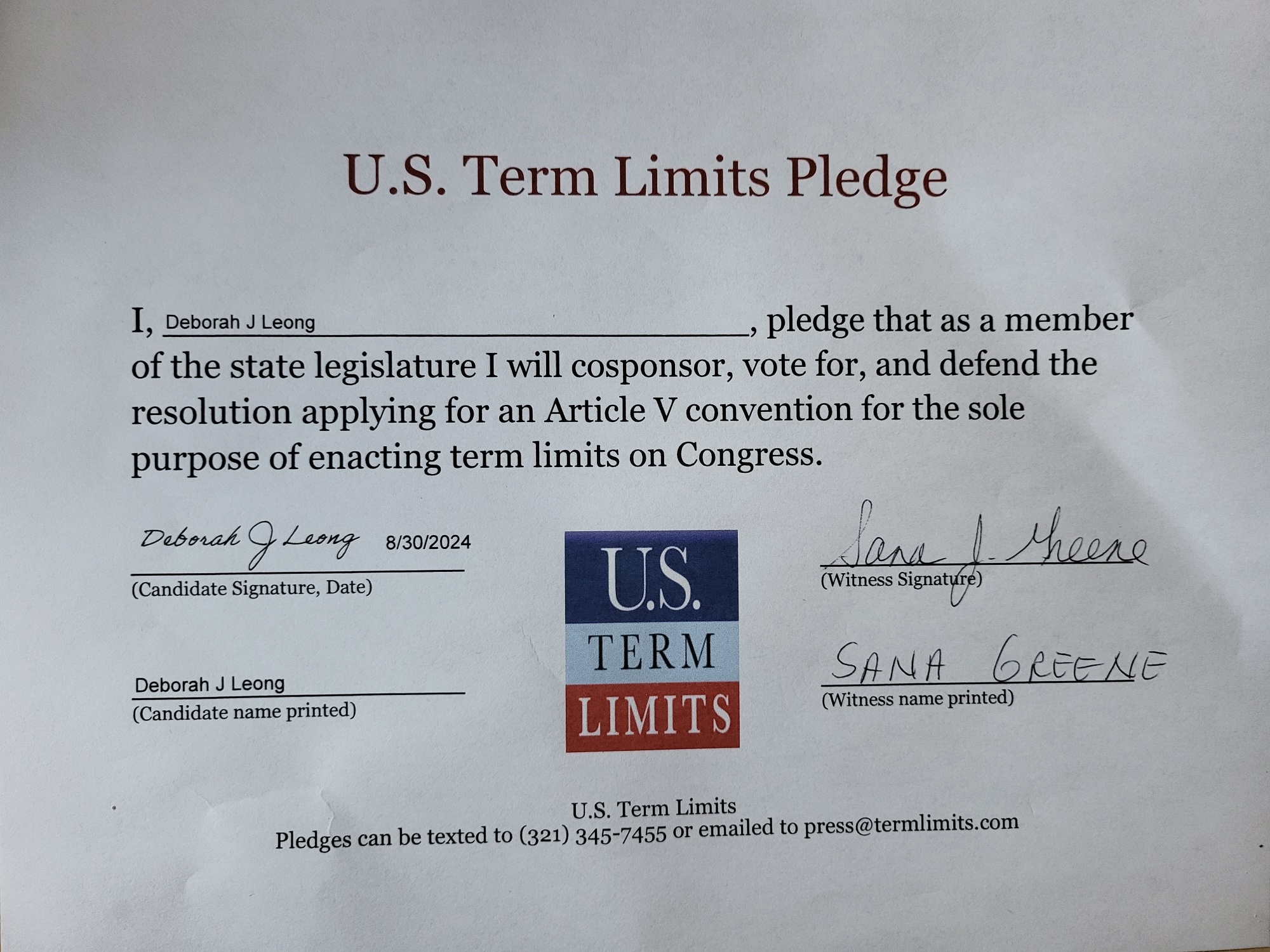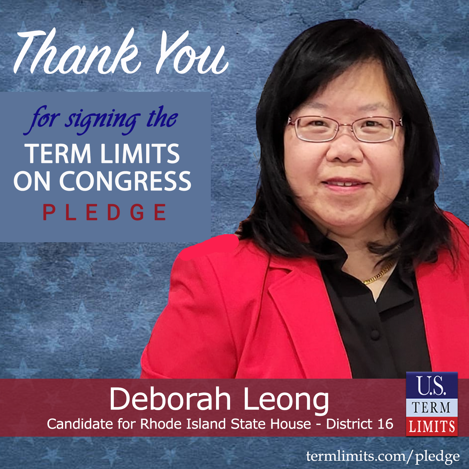 Cranston, RI – U.S. Term Limits (USTL), the leader in the national, non-partisan movement to limit terms for elected officials, is gathering support from state lawmakers across the nation. Its mission is to get 34 states to apply for an amendment proposal convention specific to term limits on Congress. Rhode Island state house candidate, Deborah Leong (District 16), has committed support for term limits on Congress by signing the term limits convention pledge.