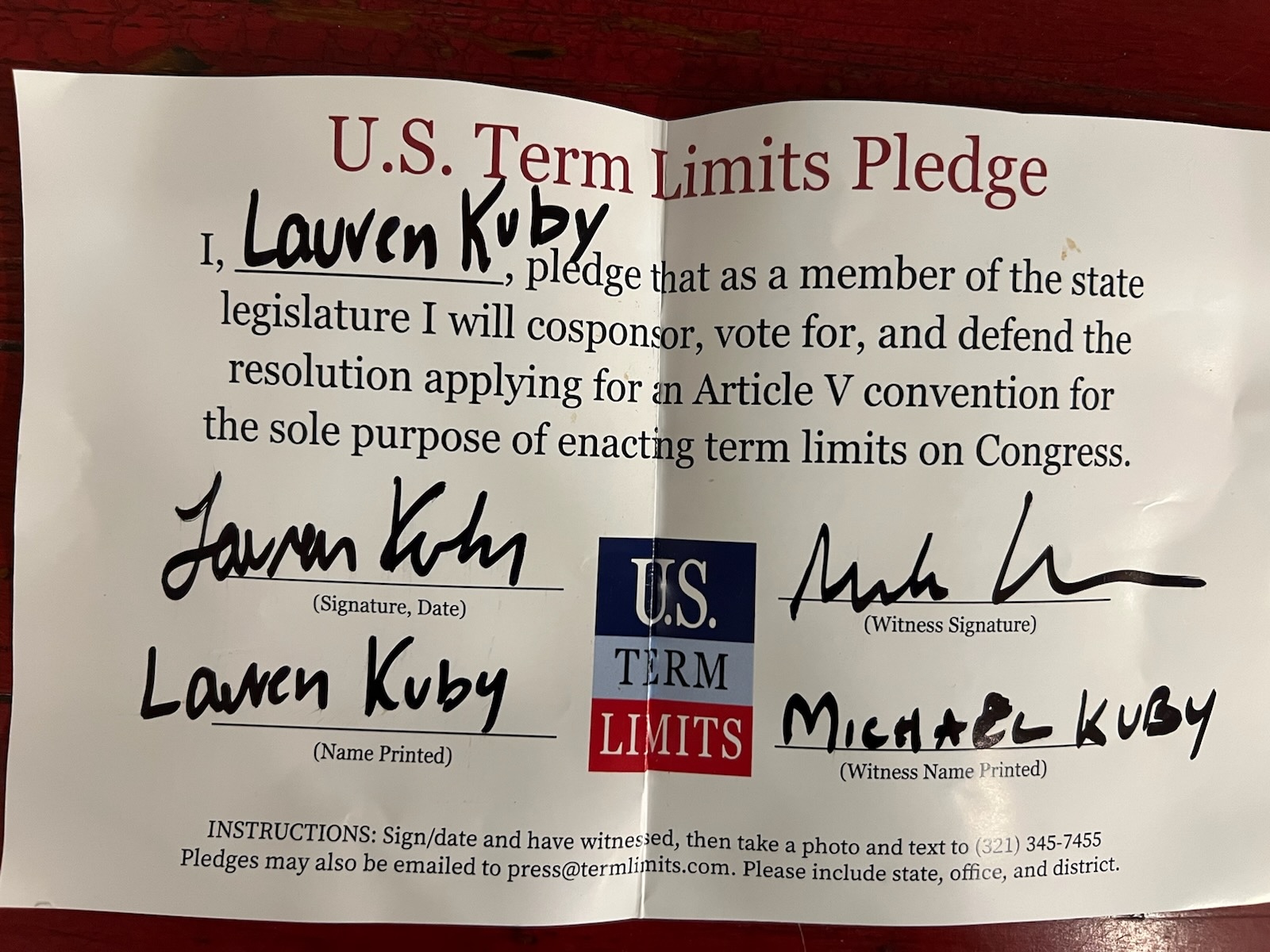 The U.S. Term Limits pledge is provided to candidates and members of state legislatures. It reads, “I pledge that, as a member of the state legislature, I will cosponsor, vote for, and defend the resolution applying for an Article V convention for the sole purpose of enacting term limits on Congress.”