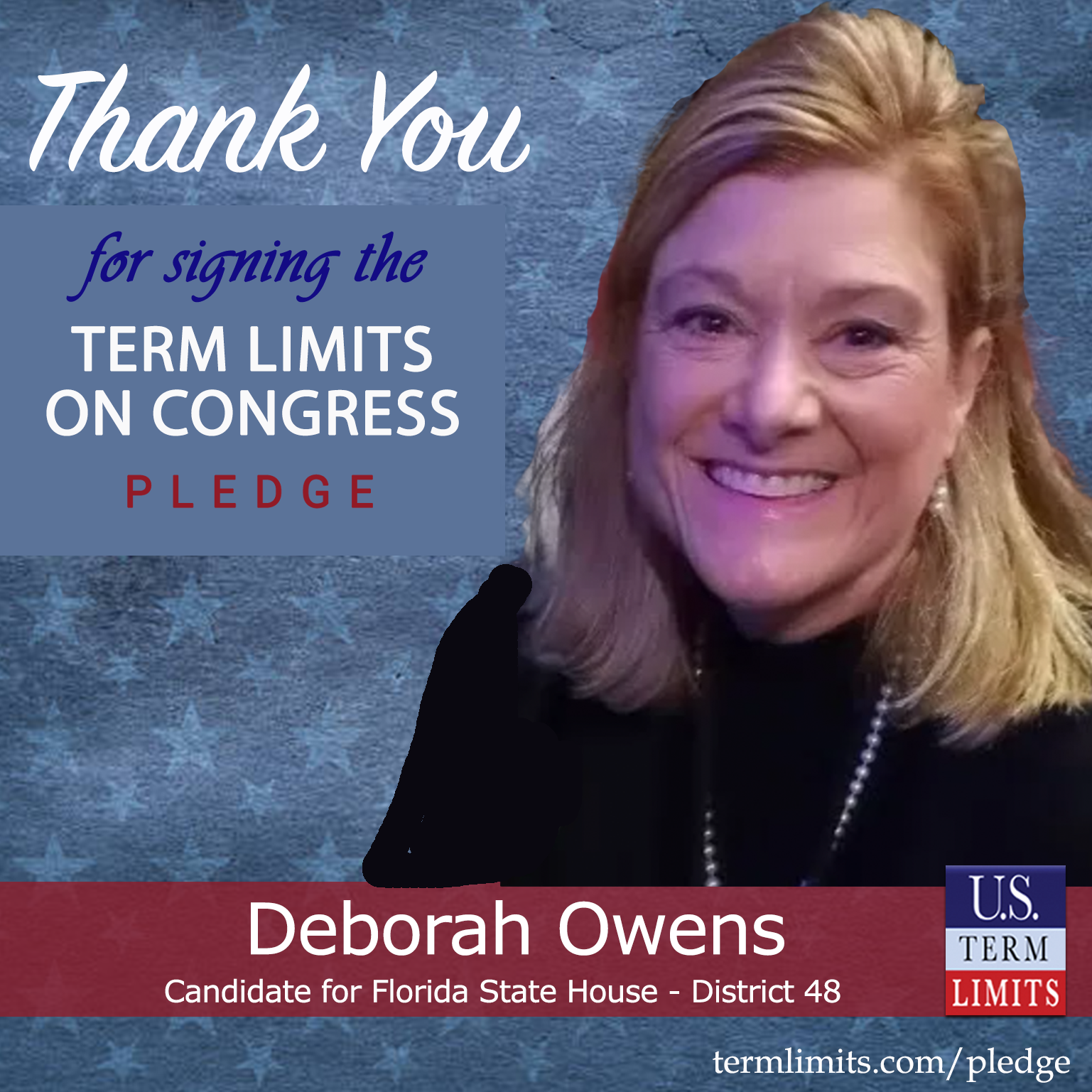 USTL President, Philip Blumel, commented on Owens’s pledge saying, “Deborah’s strong support of term limits shows that there are individuals who are willing to listen to the majority of voters who want term limits. America needs a Congress that will be served by citizen legislators, not career politicians.”