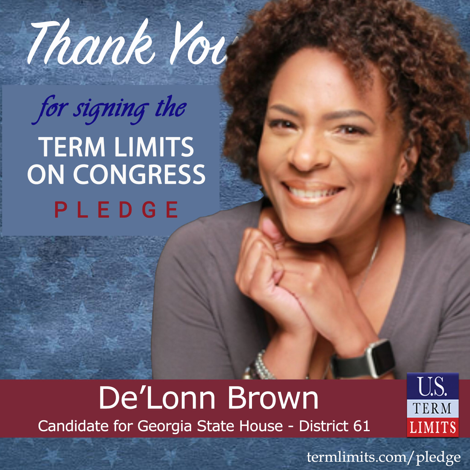 USTL President, Philip Blumel, commented on Brown’s pledge saying, “De’Lonn’s strong support of term limits shows that there are individuals who are willing to listen to the majority of voters who want term limits. America needs a Congress that will be served by citizen legislators, not career politicians.”