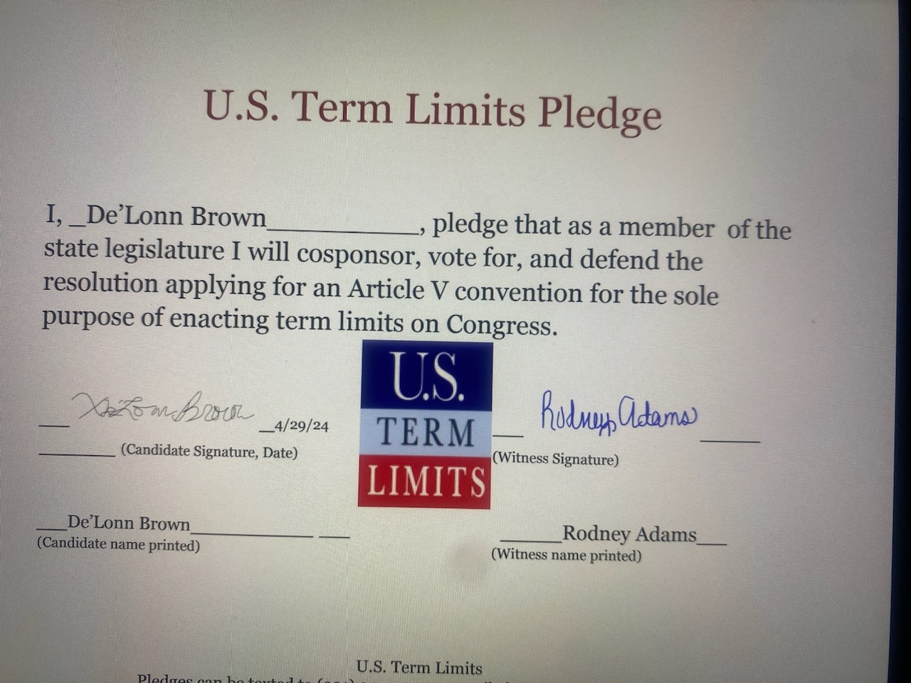 De’Lonn Brown Pledges to Support Congressional Term Limits