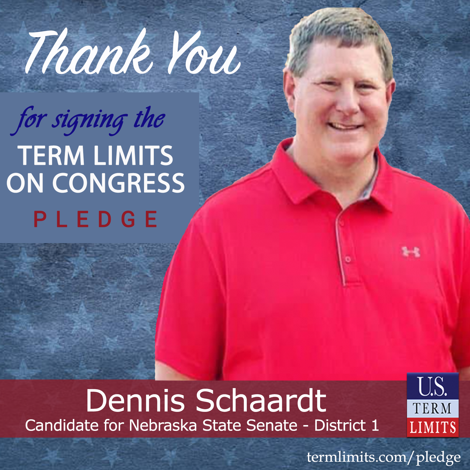 Auburn, NE – U.S. Term Limits (USTL), the leader in the national, non-partisan movement to limit terms for elected officials, is gathering support from state lawmakers across the nation. Its mission is to get 34 states to apply for an amendment proposal convention specific to term limits on Congress. Nebraska state senate candidate, Dennis Schaardt (District 1), has committed support for term limits on Congress by signing the term limits convention pledge. Previously, candidate Bob Hallstrom and Senator Julie Slama also signed the pledge.