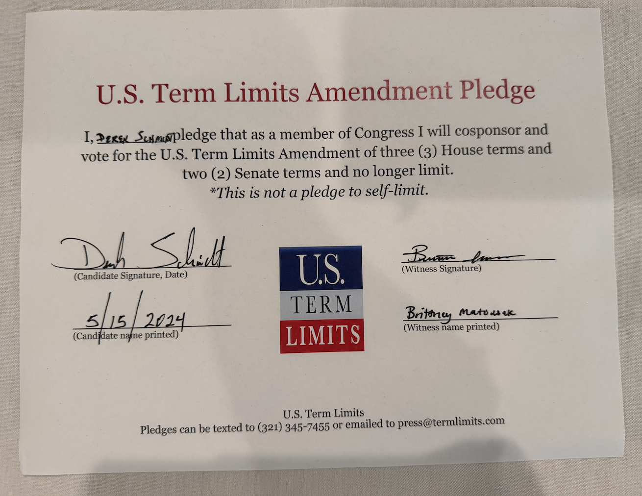 U.S. Term Limits has the support of more than 130 pledge signers in Congress. USTL President Philip Blumel commented on Schmidt’s pledge saying, “Derek’s strong support of term limits shows that there are individuals who are willing to put self-interest aside to follow the will of the people. America needs a Congress that will be served by citizen legislators, not career politicians.”