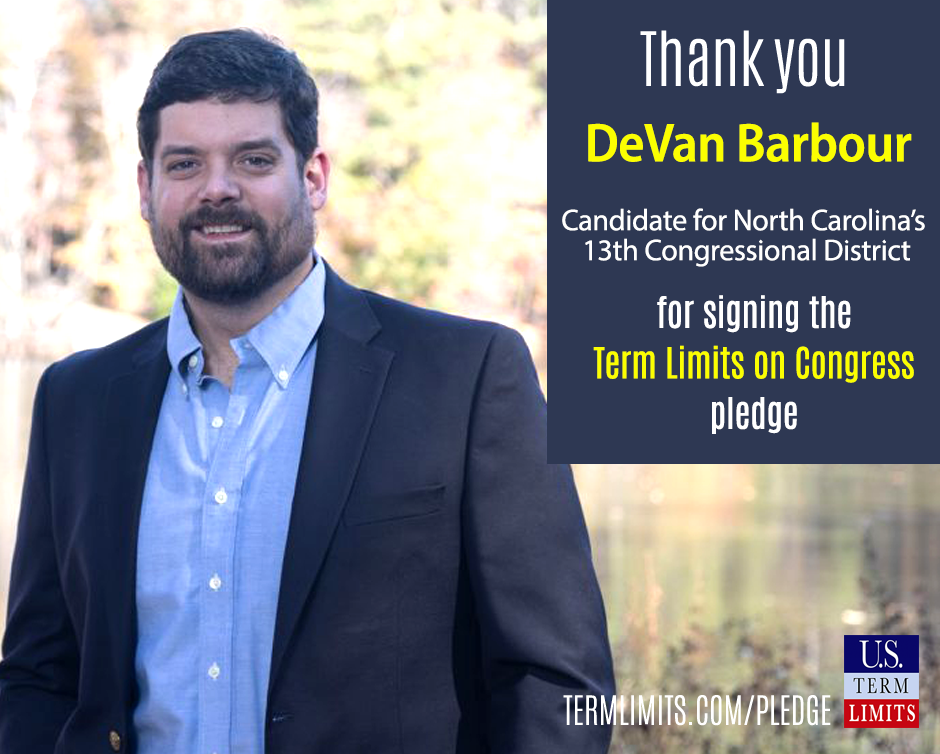 Washington D.C. – U.S. Term Limits (USTL), the leader in the non-partisan national movement to limit terms for elected officials, praises 2022 U.S. house candidate for North Carolina, DeVan Barbour (district 13), for signing the pledge for an amendment to term limit Congress. Previously, candidates Renee Ellmers and Bo Hines also signed the pledge.