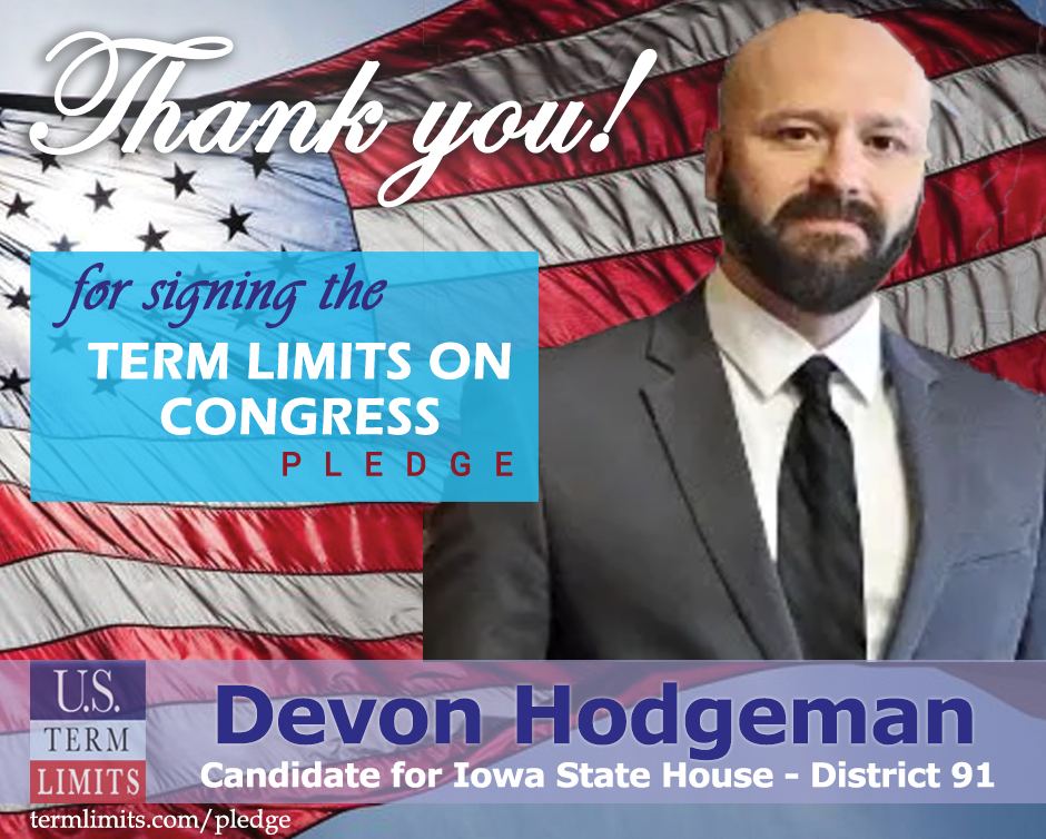 Muscatine, IA – U.S. Term Limits (USTL), the leader in the national, non-partisan movement to limit terms for elected officials, is gathering support from state lawmakers across the nation. Its mission is to get 34 states to apply for an amendment proposal convention specific to term limits on Congress. Iowa state house candidate, Devon Hodgeman (district 91), has committed support for term limits on Congress by signing the U.S. Term Limits pledge.  Hodgeman is the first signer in this race.