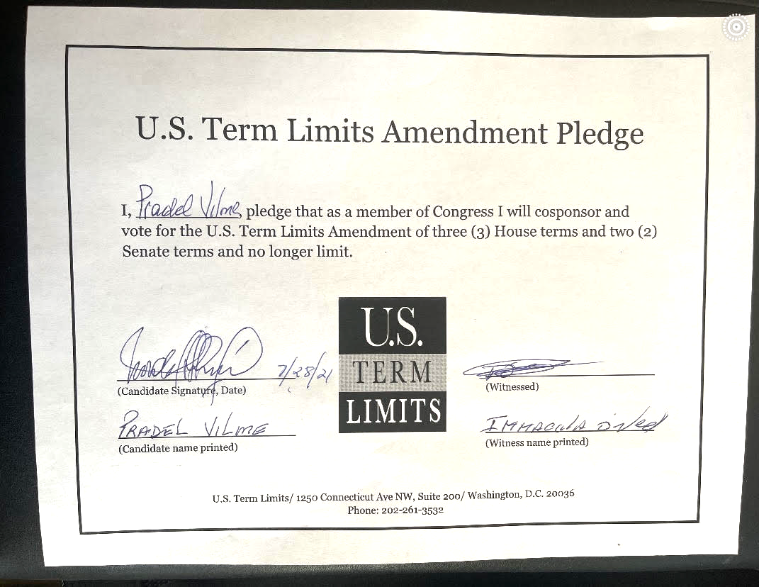 The U.S. Term Limits pledge is provided to candidates and members of state legislatures. It reads, “I pledge that, as a member of the state legislature, I will cosponsor, vote for, and defend the resolution applying for an Article V convention for the limited purpose of enacting term limits on Congress.”