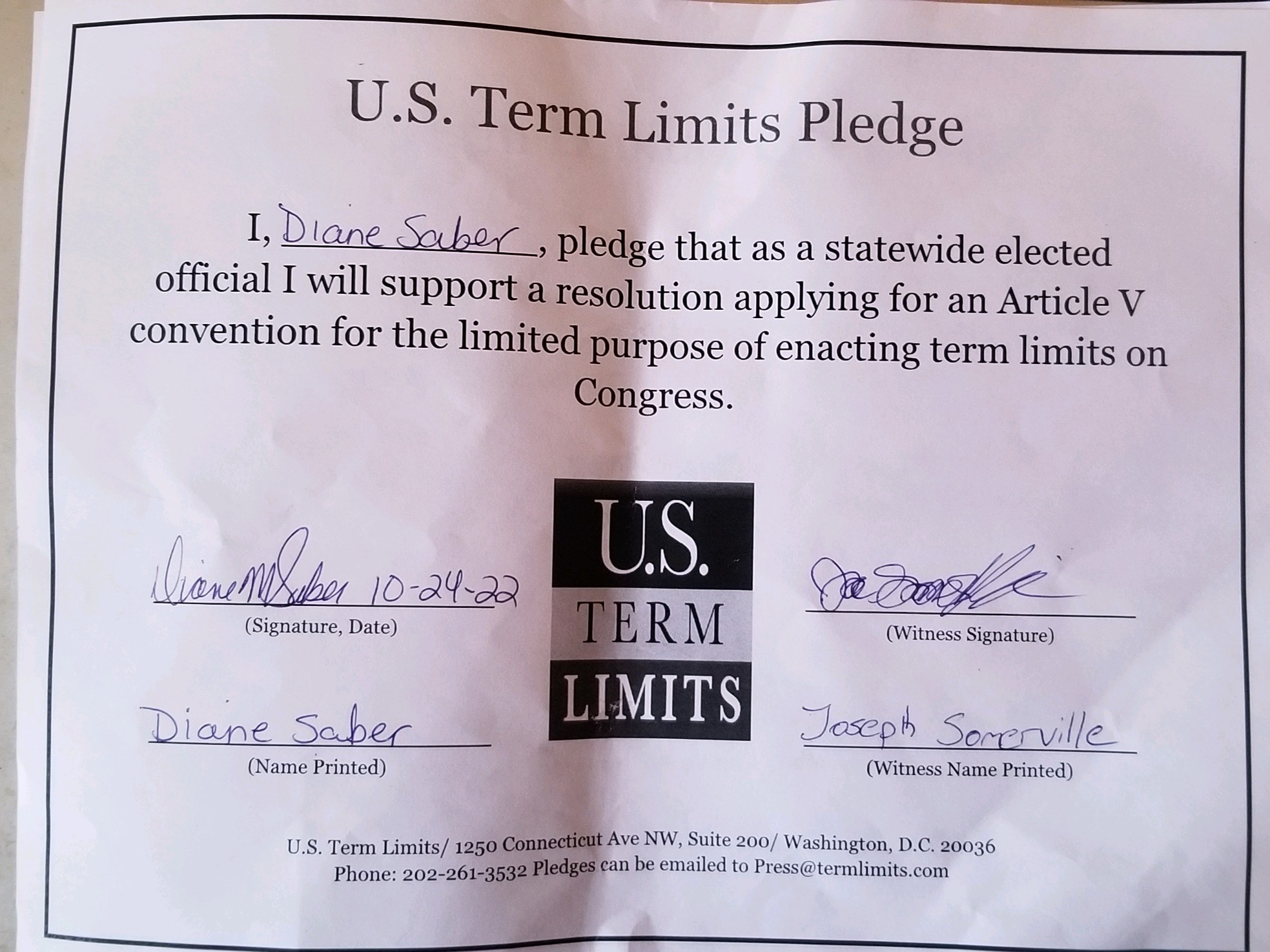 Diane Saber Pledges to Support Congressional Term Limits