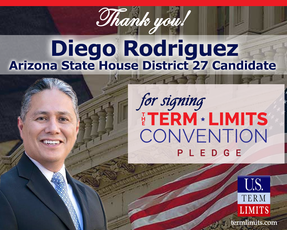Washington, D.C. – U.S. Term Limits (USTL), the leader in the national, non-partisan movement to limit terms for elected officials, is gathering support from state lawmakers across the nation. Its mission is to get 34 states to apply for an amendment proposal convention specific to term limits on Congress. Arizona state house candidate Diego Rodriguez, district 27, has committed his support for term limits on Congress by signing the Term Limits Convention pledge.
