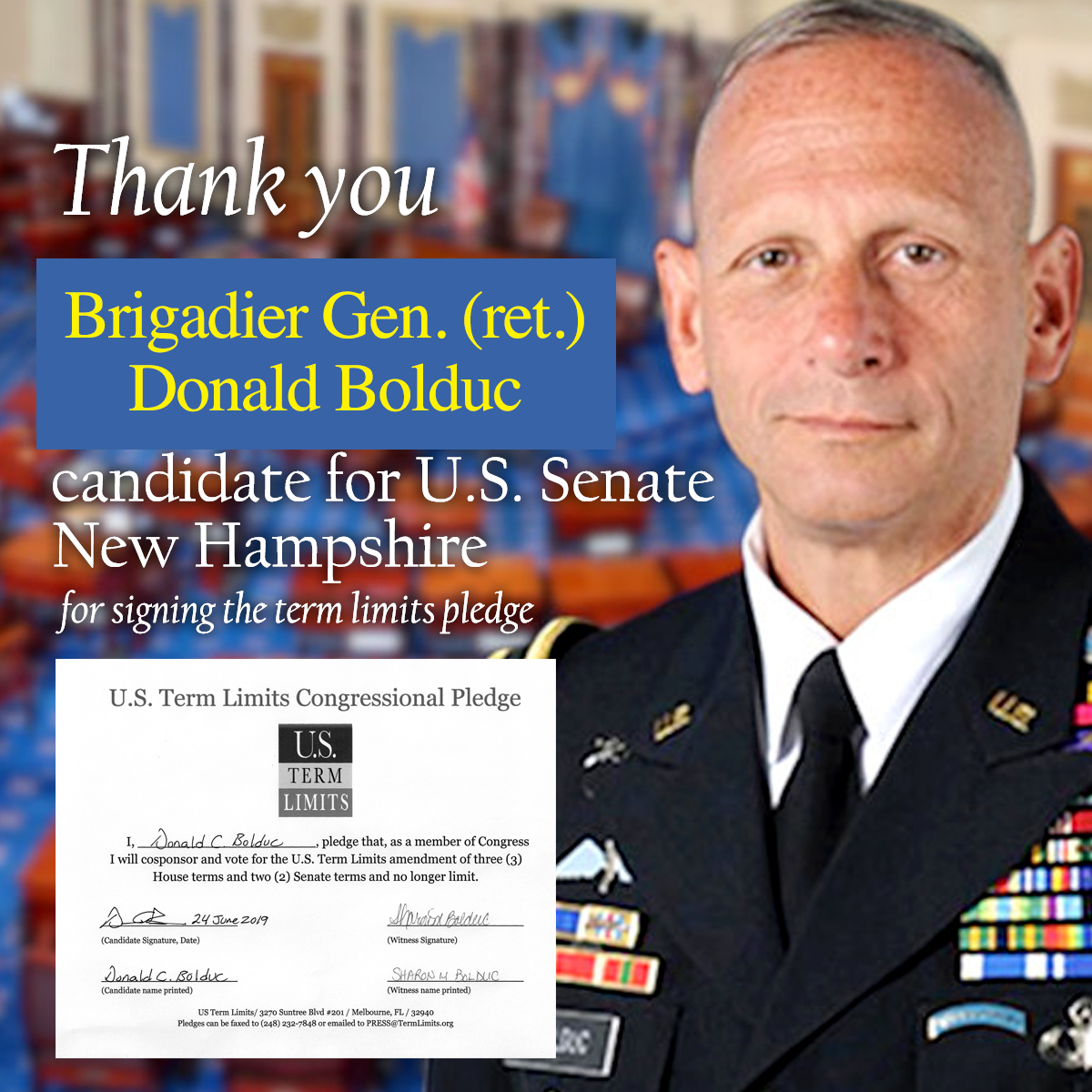 Washington, D.C. – U.S. Term Limits (USTL), the leader in the non-partisan national movement to limit terms for elected officials, praises retired Brig. Gen. Don Bolduc, 2020 U.S. Senate candidate from New Hampshire, for signing the pledge for an amendment to term limit Congress.