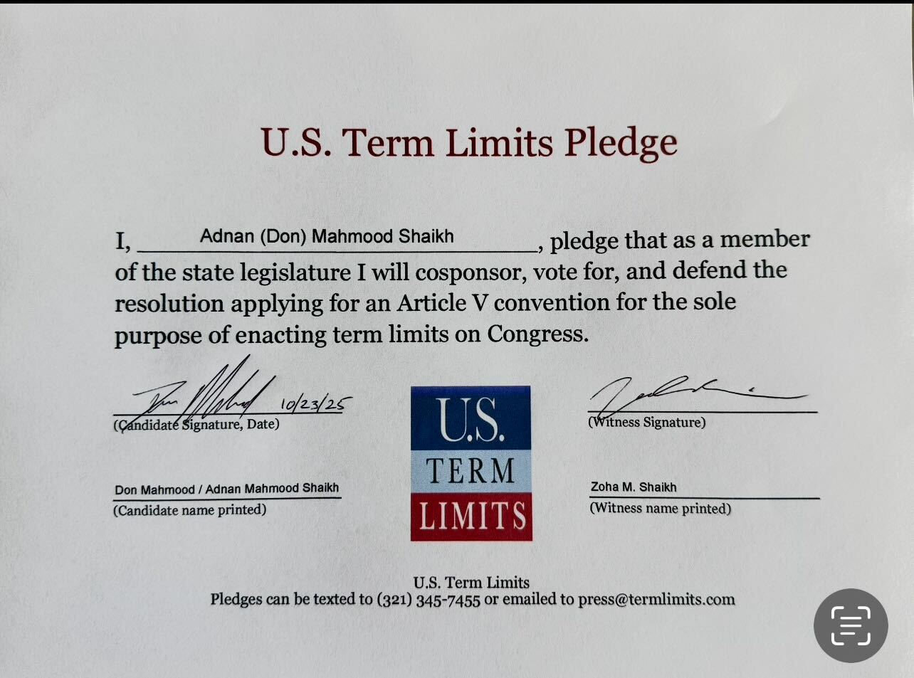 Lilburn, GA – U.S. Term Limits (USTL), the leader in the national, non-partisan movement to limit terms for elected officials, is gathering support from state lawmakers across the nation. Its mission is to get 34 states to apply for an amendment proposal convention specific to term limits on Congress. Georgia state house candidate, Don Mahmood (district 109), has committed support for term limits on Congress by signing the term limits convention pledge.