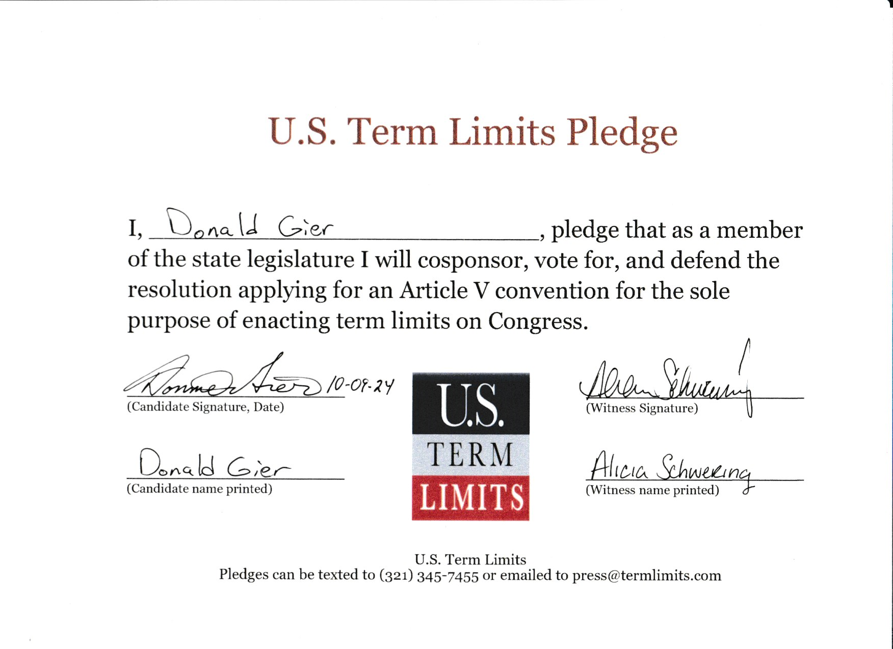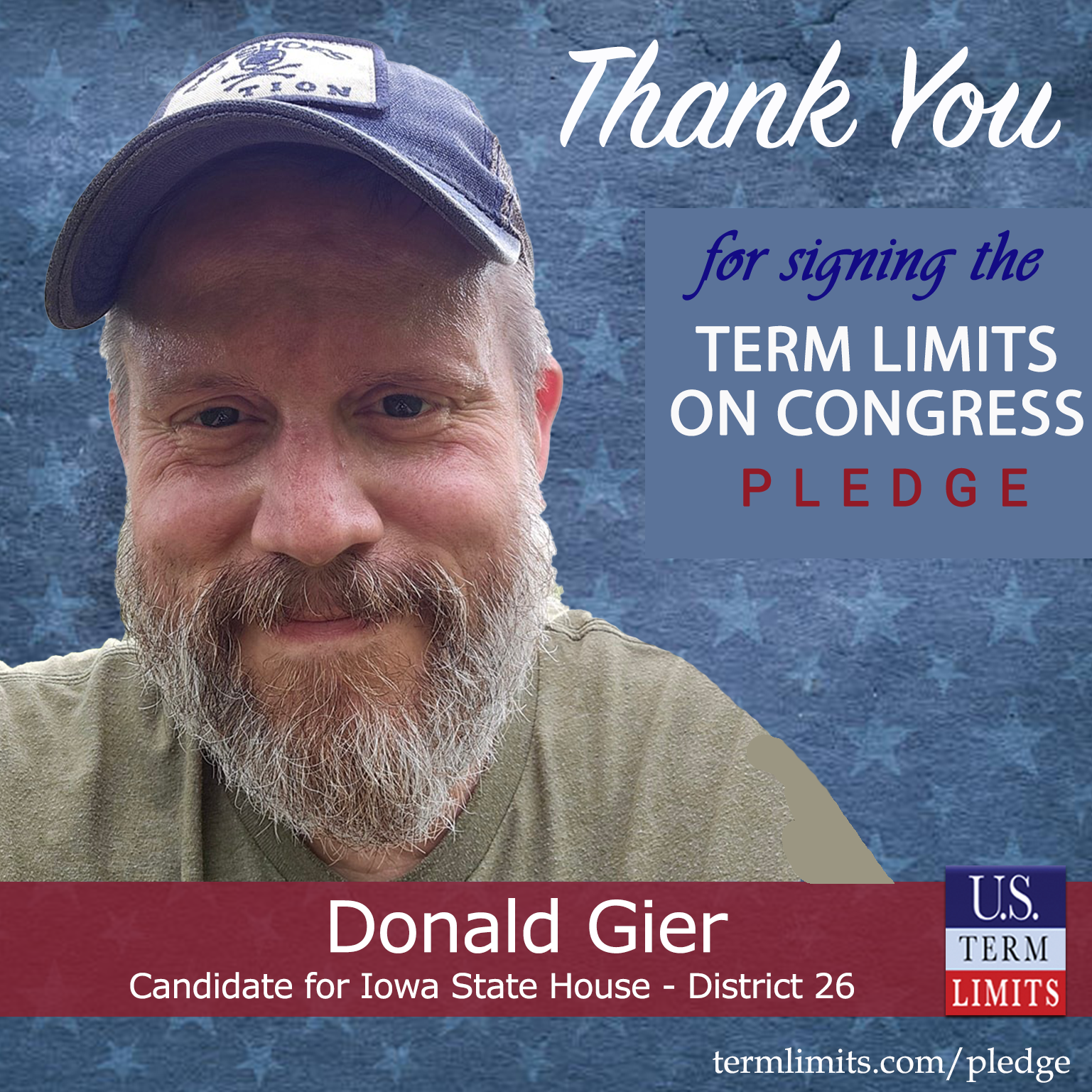 Moulton, IA– U.S. Term Limits (USTL), the leader in the national, non-partisan movement to limit terms for elected officials, is gathering support from state lawmakers across the nation. Its mission is to get 34 states to apply for an amendment proposal convention specific to term limits on Congress. Iowa state house candidate, Donald Gier (district 26), has committed support for term limits on Congress by signing the term limits convention pledge.