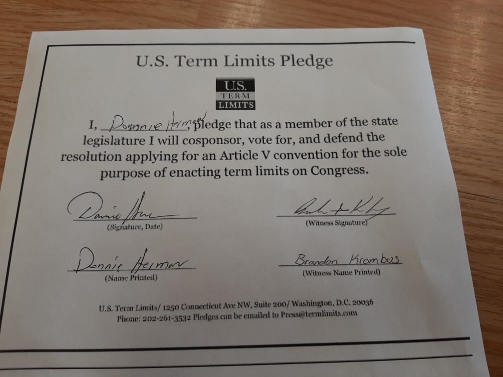 Washington, D.C. – U.S. Term Limits (USTL), the leader in the national, non-partisan movement to limit terms for elected officials, is gathering support from state lawmakers across the nation. Its mission is to get 34 states to apply for an amendment proposal convention specific to term limits on Congress. 2020 Wisconsin state house candidate, Donnie Herman (district 54) has committed support for term limits on Congress by signing the Term Limits Convention pledge. Herman is the first signer in this race. The primary election is scheduled for August 11, 2020.