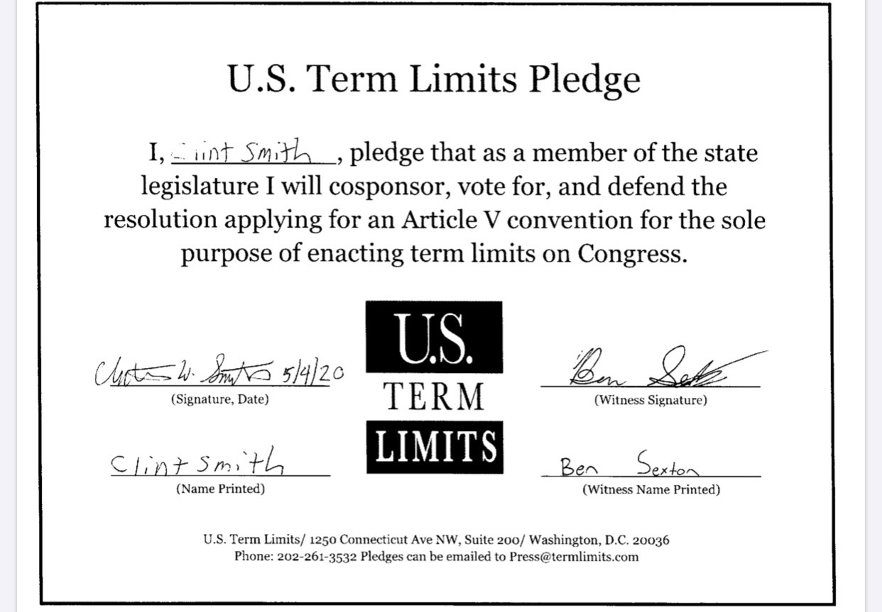 The U.S. Term Limits pledge is provided to candidates and members of state legislatures. It reads, “I pledge that, as a member of the state legislature, I will cosponsor, vote for, and defend the resolution applying for an Article V convention for the limited purpose of enacting term limits on Congress.”